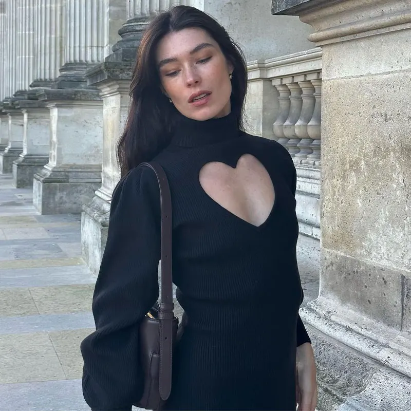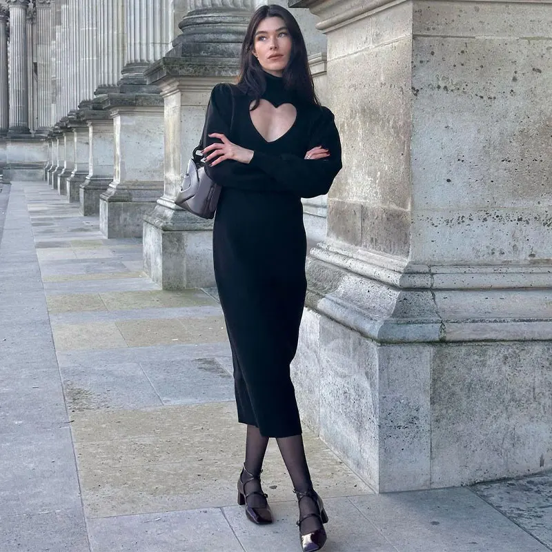 maoxiangshop - Women Heart Hollow Out Slim Long Dress Elegant Fashion Black Long Sleeve Dresses Autumn Party Street Lady Outerwear Vestido