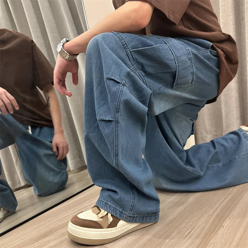 maoxiangshop Men Jeans Loose Straight Wide Leg Denim Pants Men's Hip Hop Streetwear Skateboard Neutral denim Trousers Mopping Cargo jeans