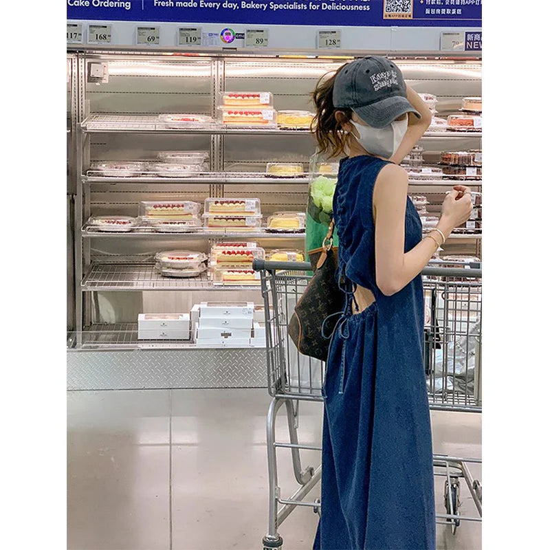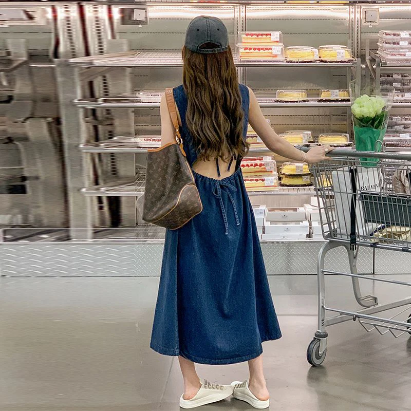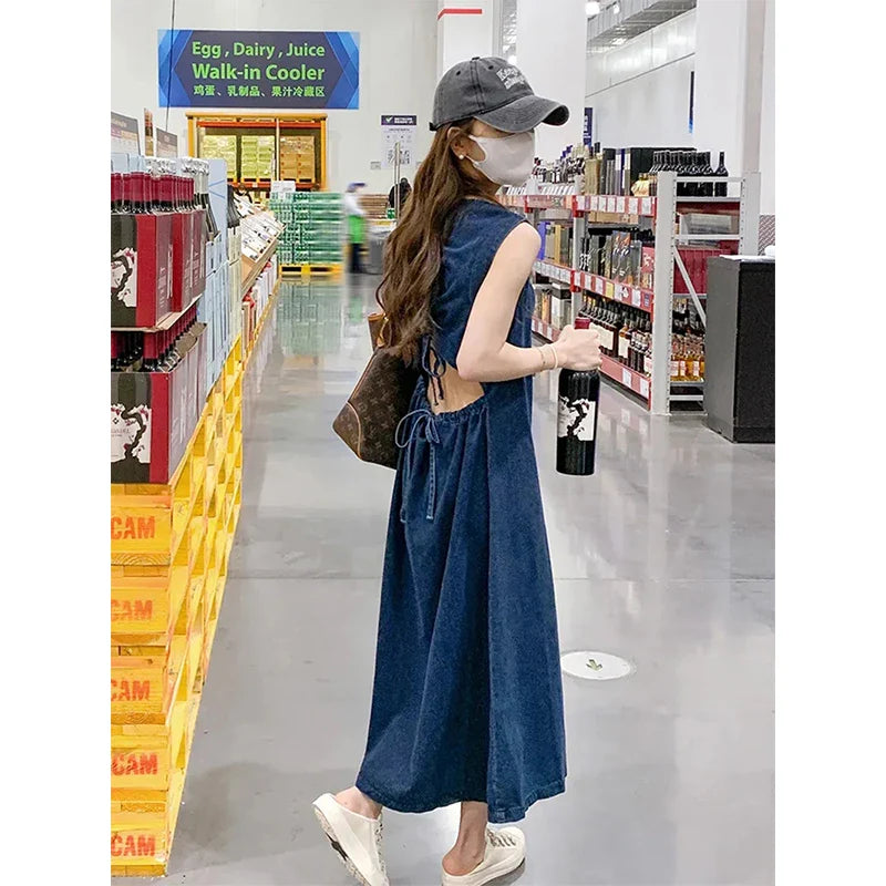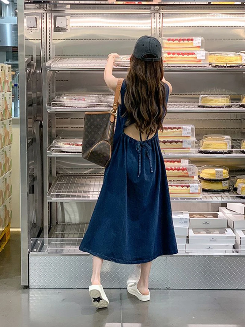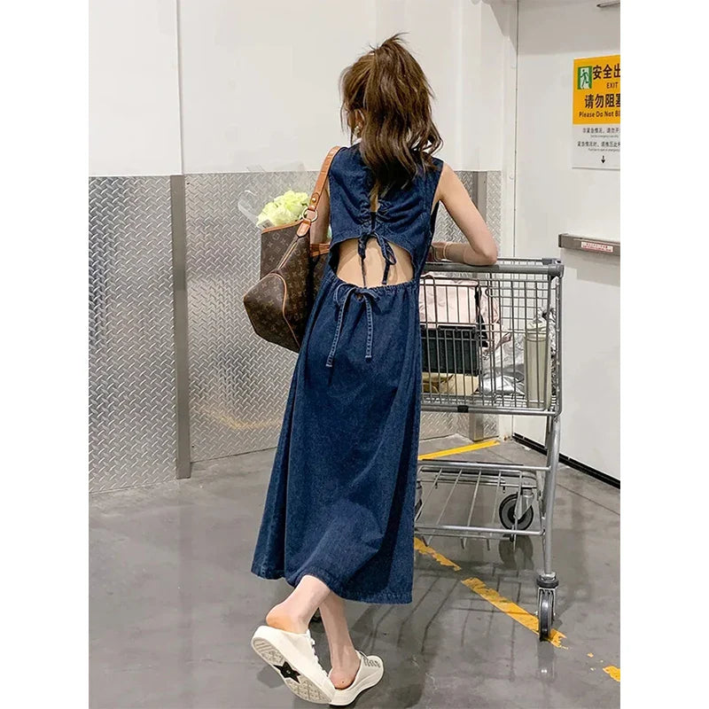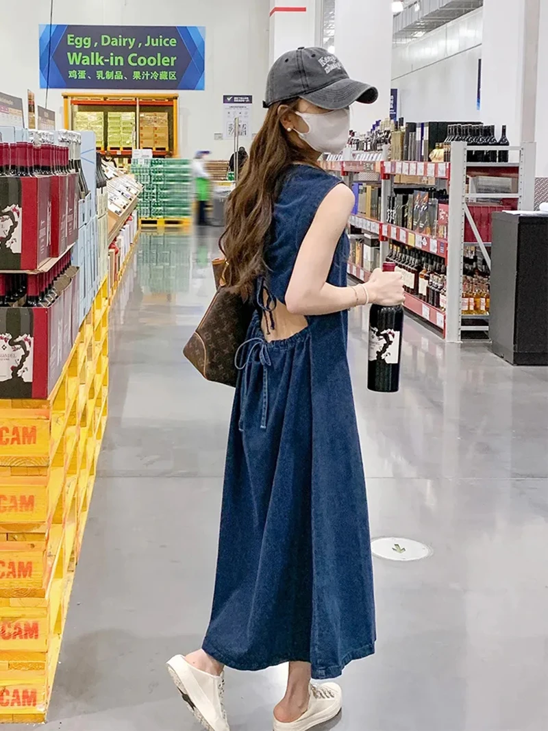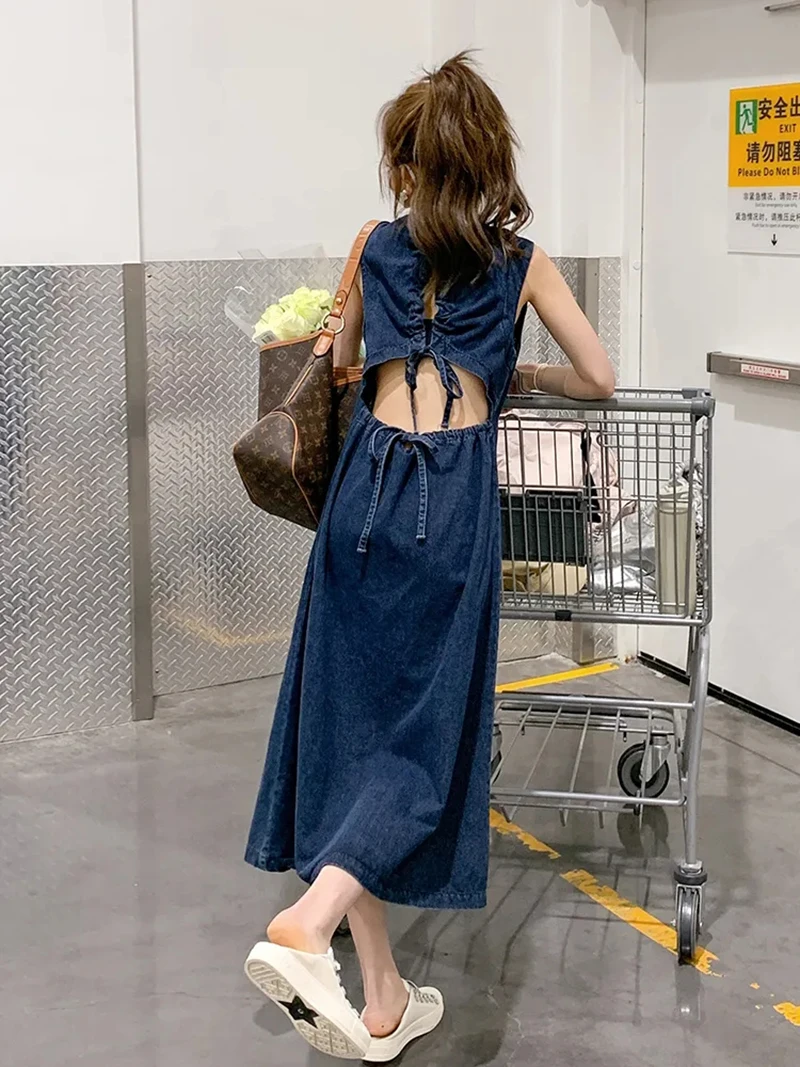Denim Midi Dress Women Hollow Out A Line Dresses Streetwear Sleeveless Backless Sundress Korean Lace Up Casual Vestidos