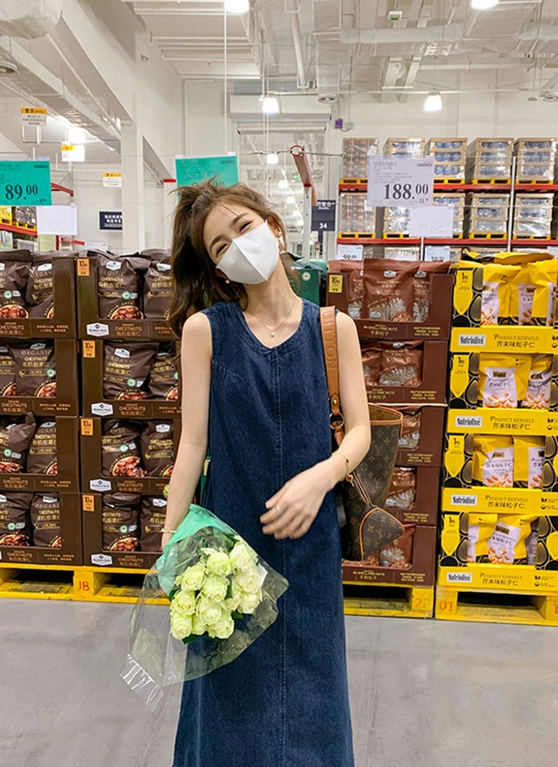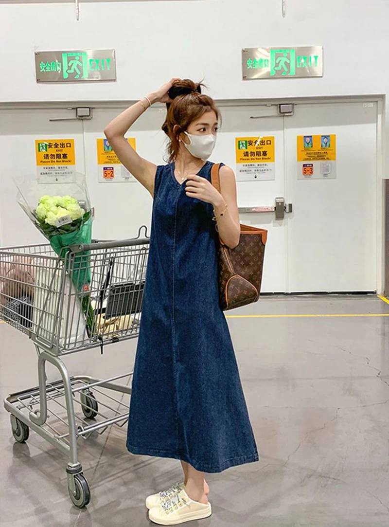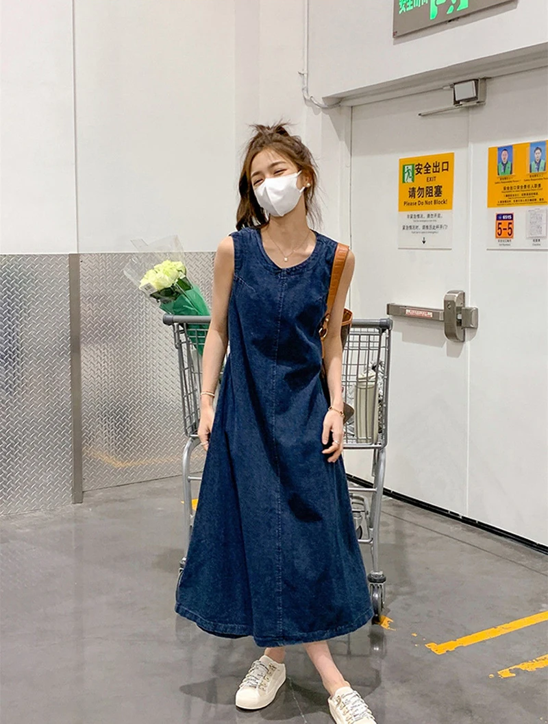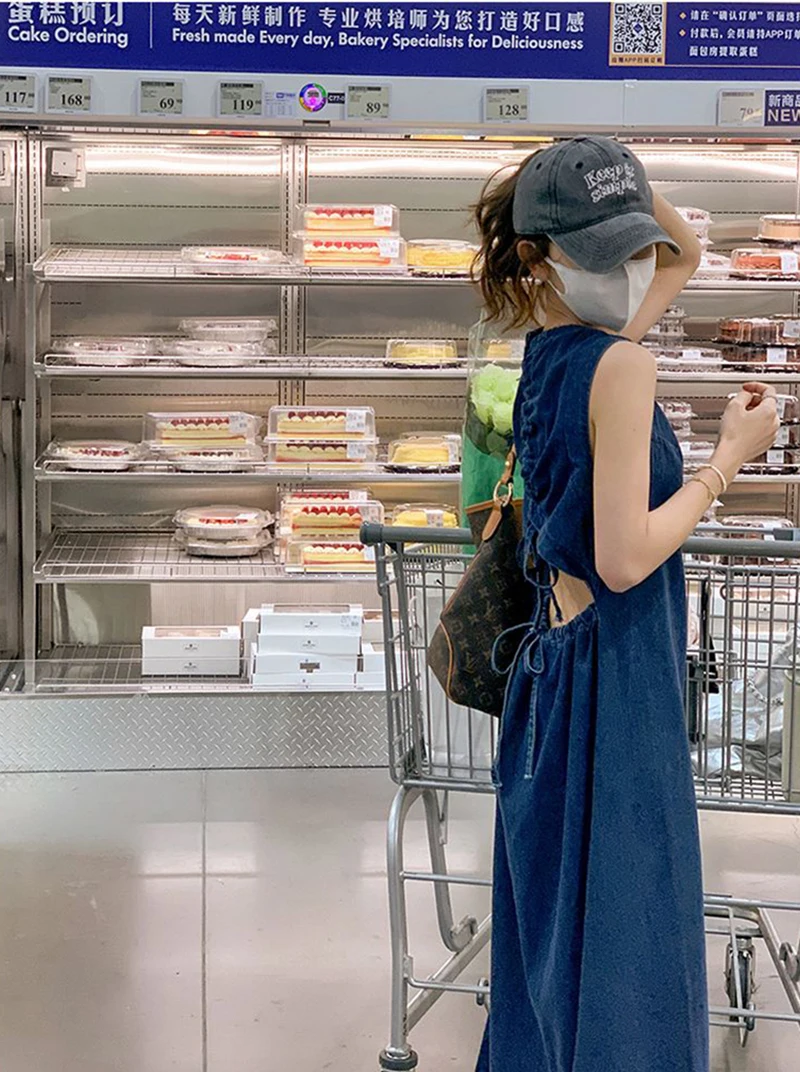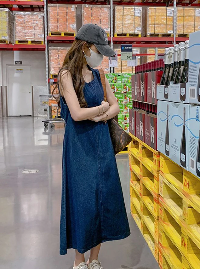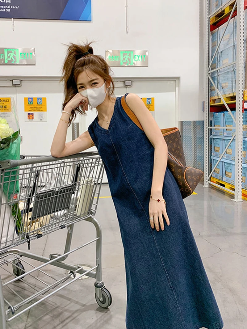 Denim Midi Dress Women Hollow Out A Line Dresses Streetwear Sleeveless Backless Sundress Korean Lace Up Casual Vestidos