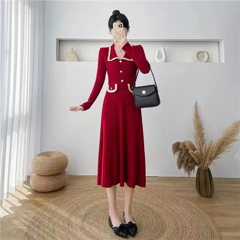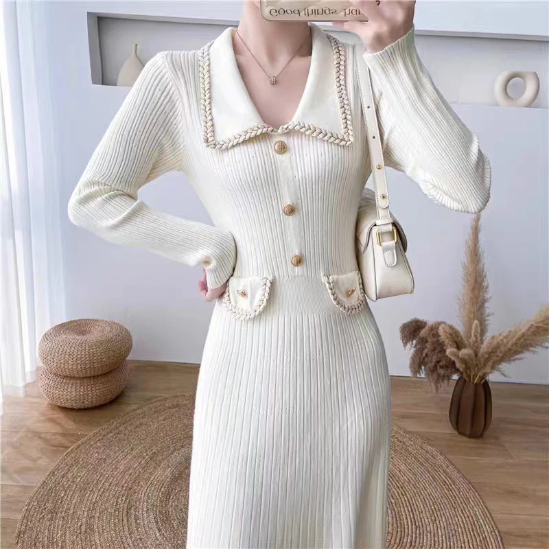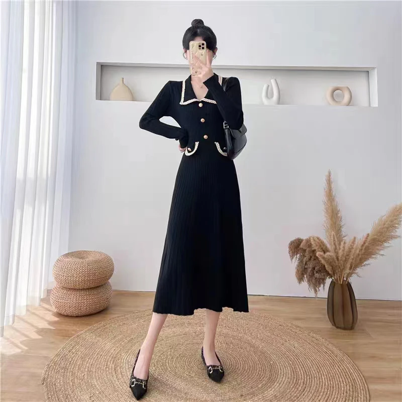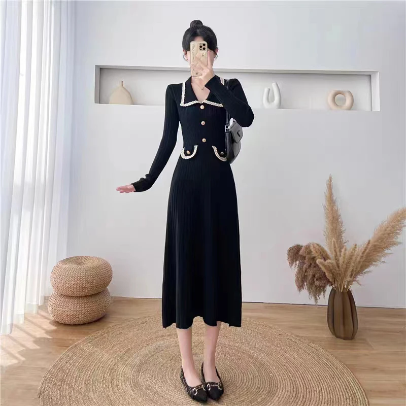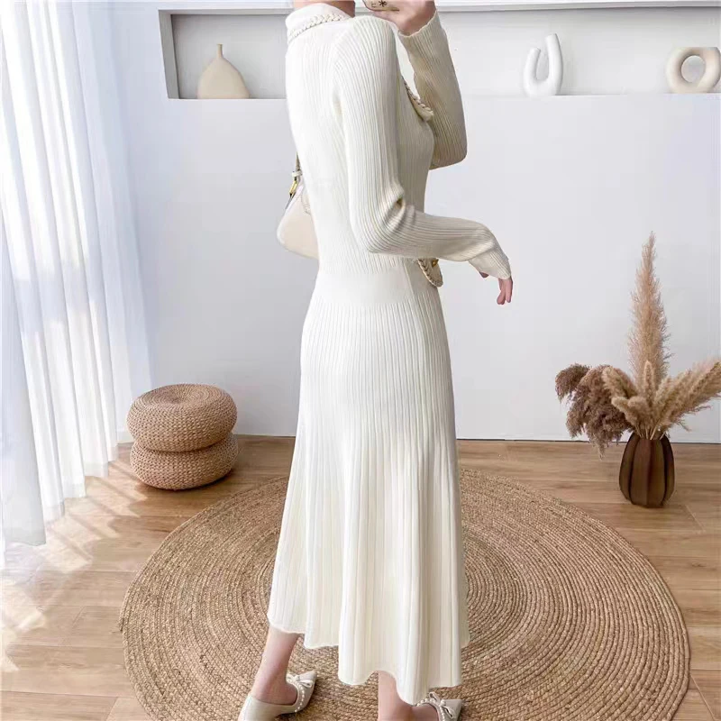 Elegant Knitted Midi Dress Women Black Long Sleeve Sweater Dresses Fall Winter Ladies Korean Fashion Bodycon Vestidos New