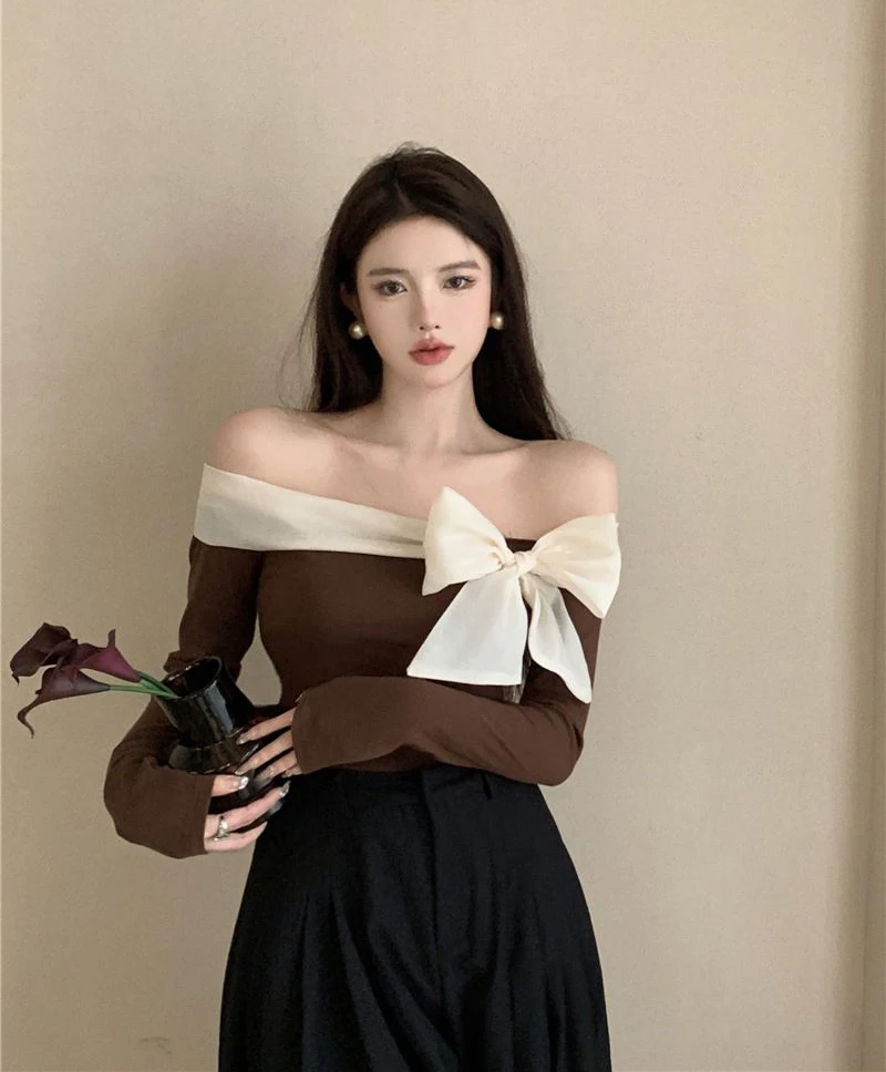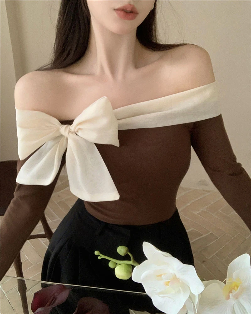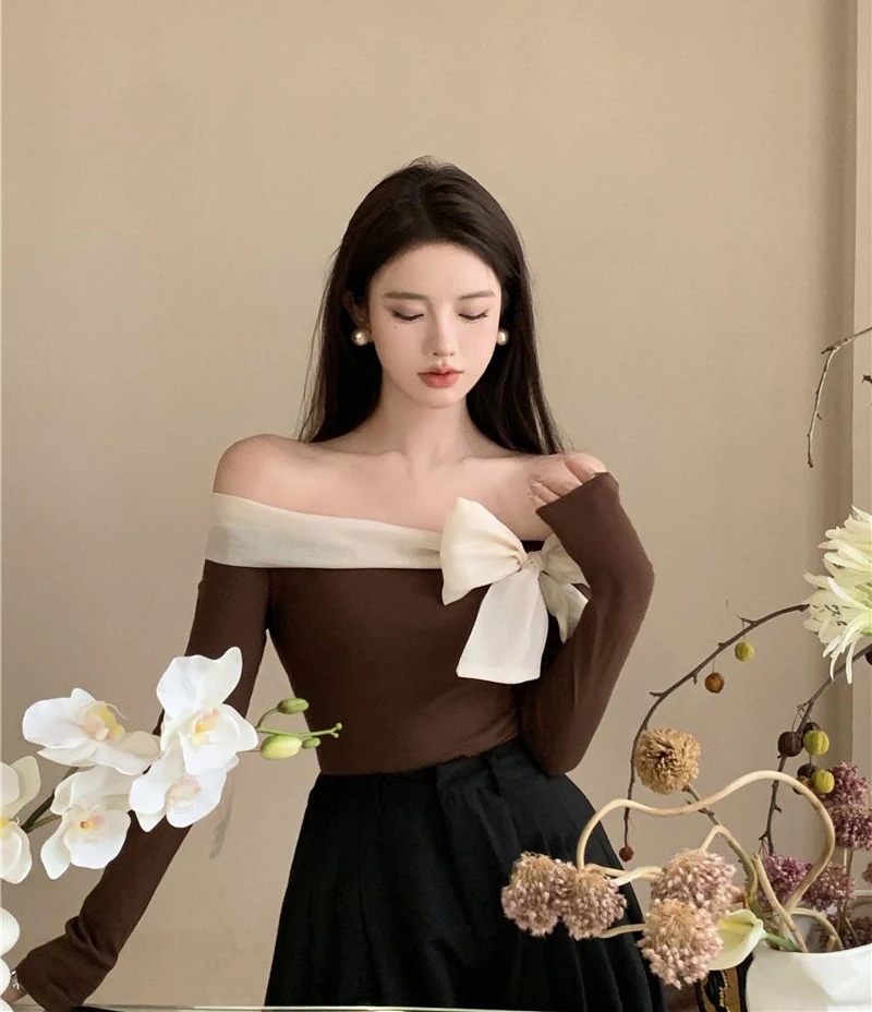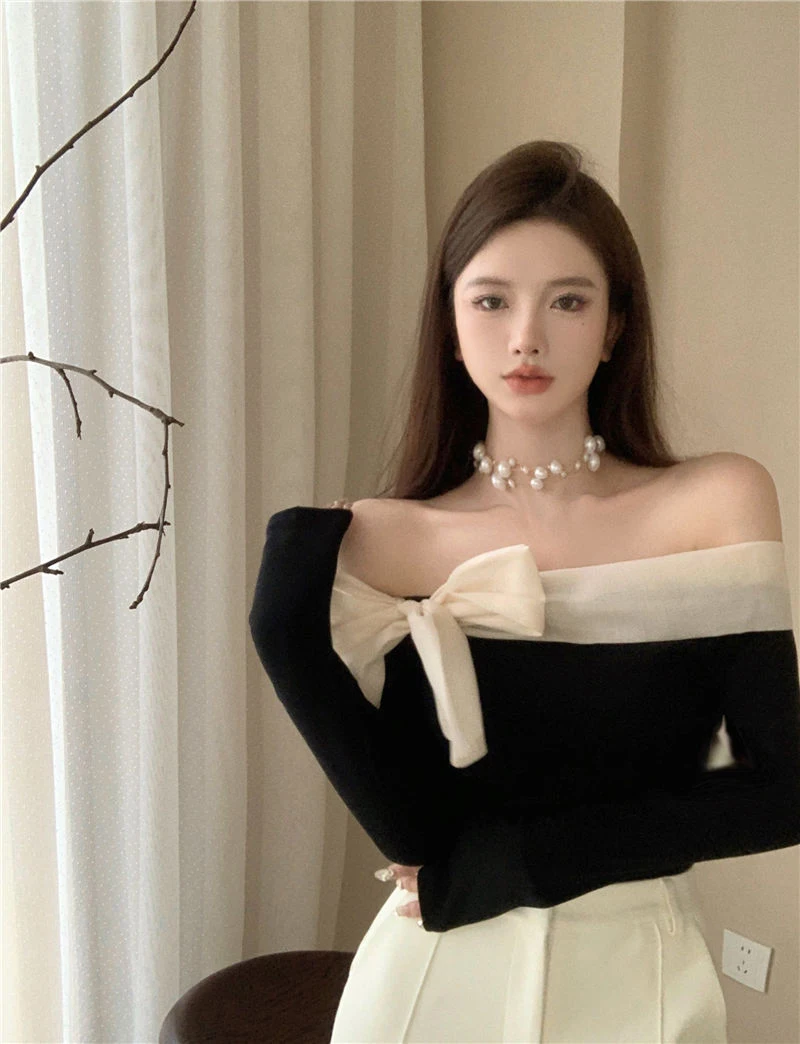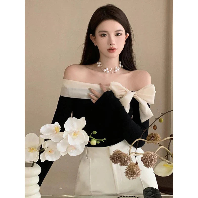 French Elegant Sweater Women Sexy Off Shoulder Bow Slash Neck Pullovers Ladies Y2K Korean Stretch Slim Long Sleeve Tops