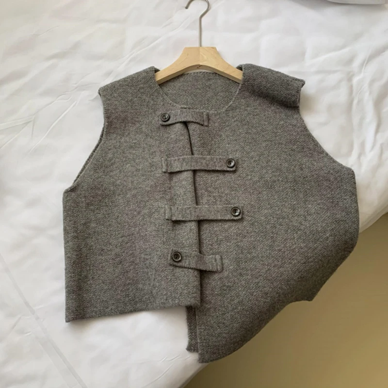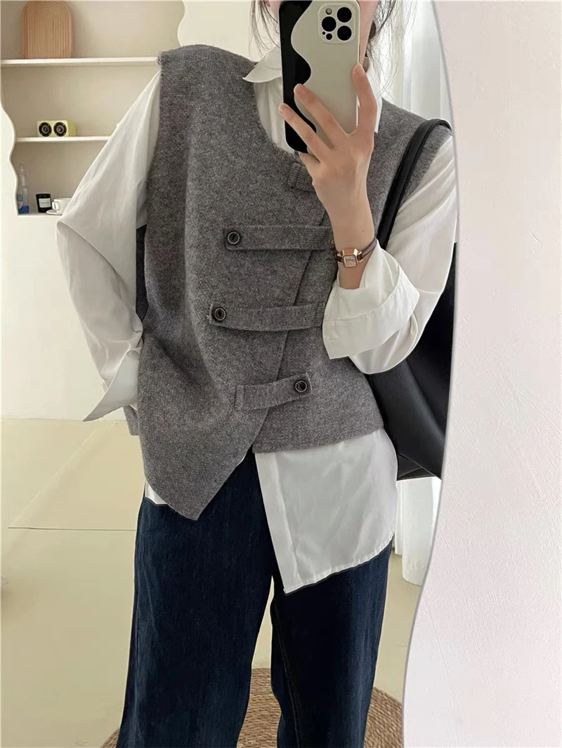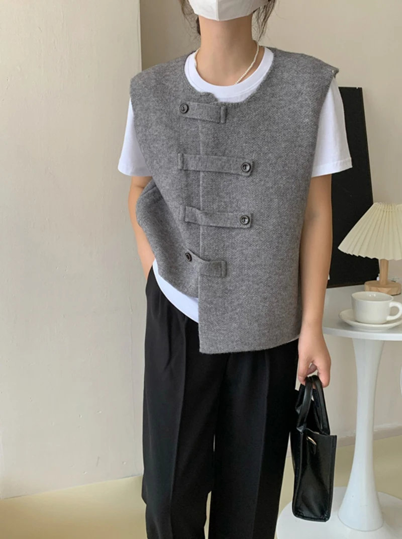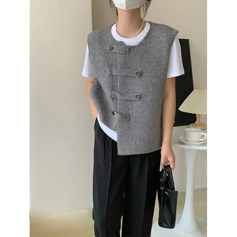 Irregular Sweater Vest Women Preppy Solid Chic Button Knit Waistcoat Korean Office Lady Elegant Knitwear Casual Top New