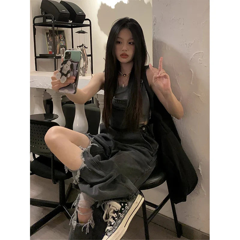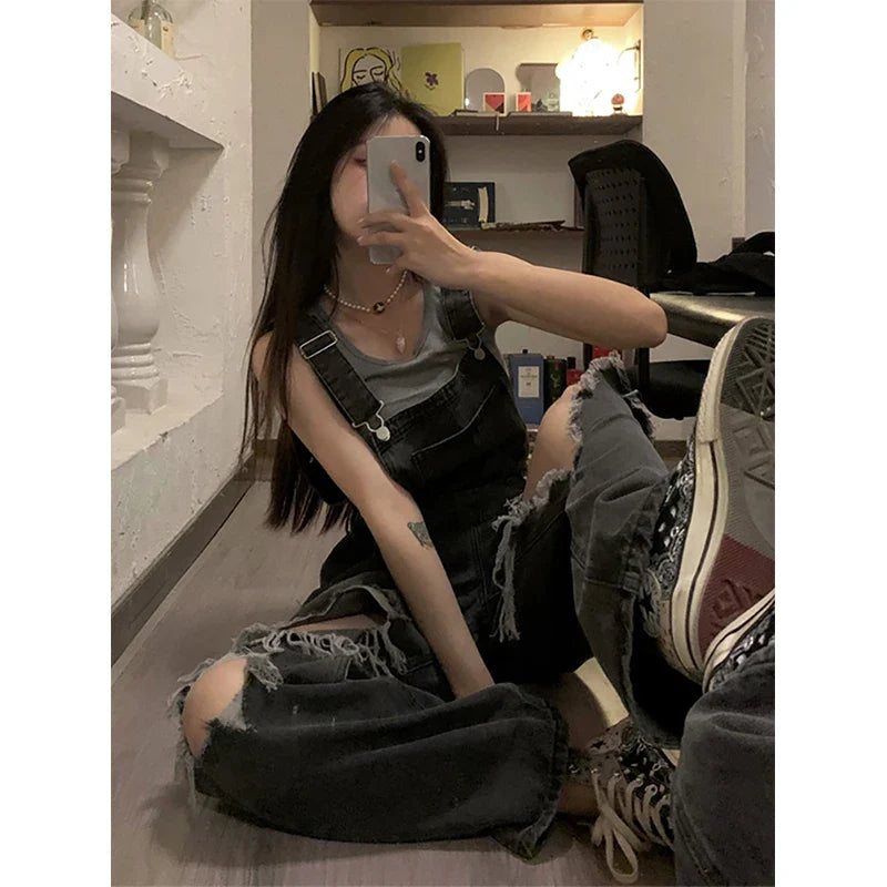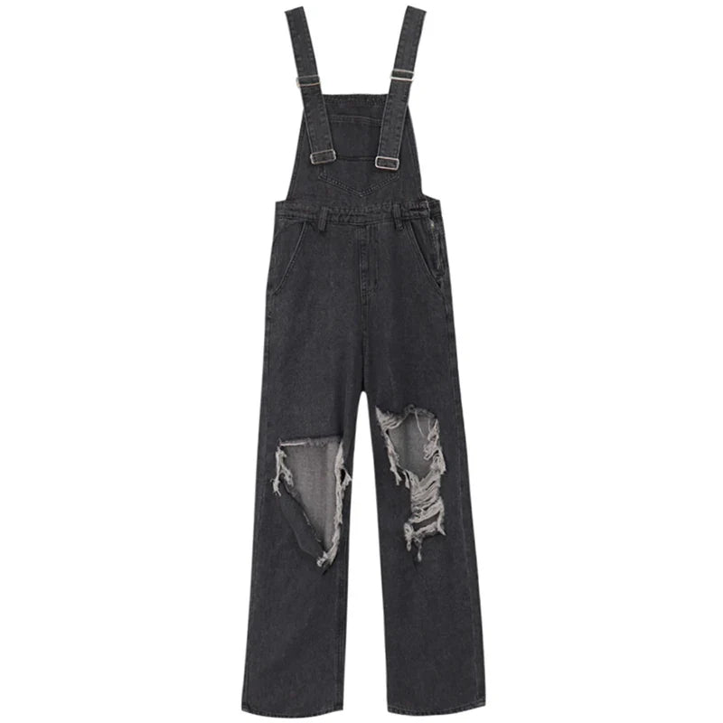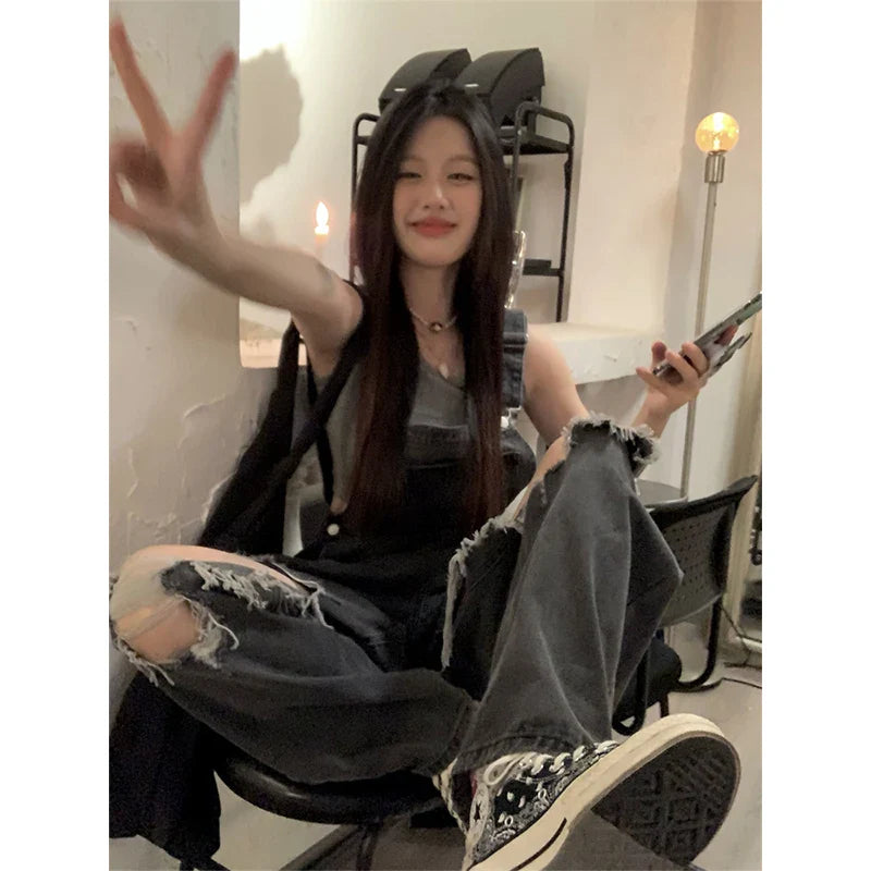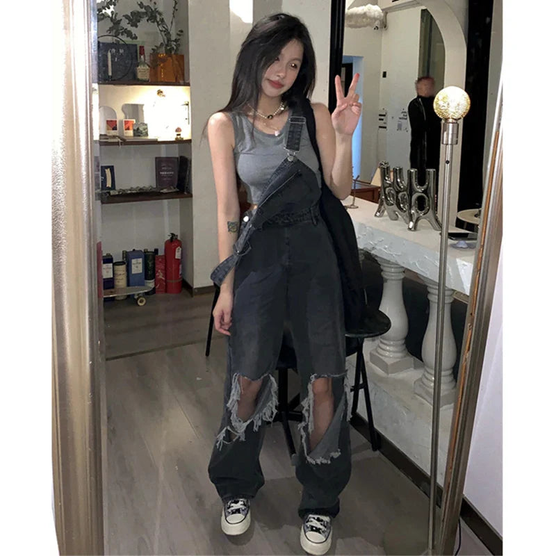 Streetwear Denim Overalls Women 5Xl Y2K Vintage Hole Wide Leg Jeans Jumpsuit Summer High Waist Loose Casual Suspend Pants