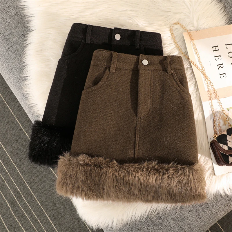 Streetwear Mini Skirt Women Y2K Faux Fur Patchwork A Line Skirts Autumn Winter Vintage Korean High Waist Slim Black Skirt