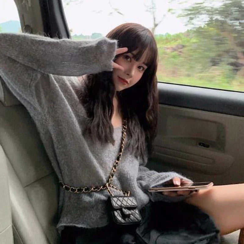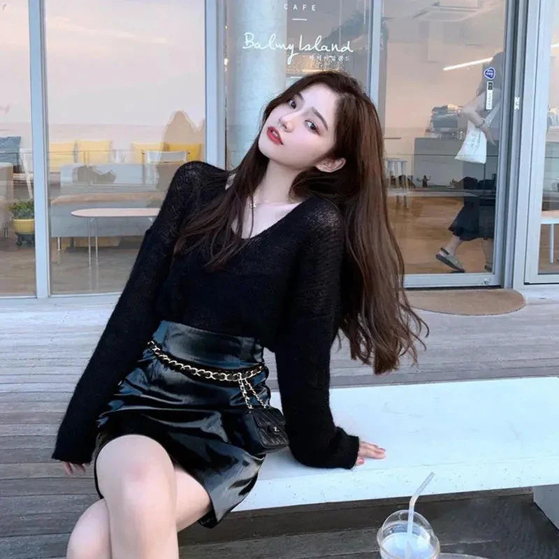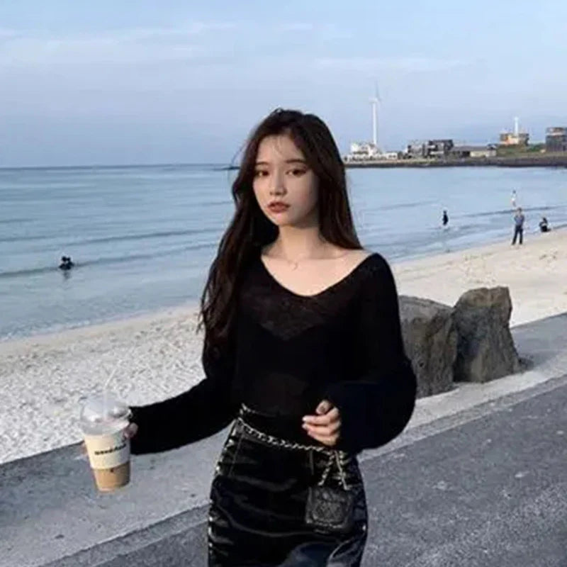 Streetwear Sweater Women Korean Hollow Out Sun-Proof Knitted Pullovers Summer V Neck See Through Jumper Solid Knitwear New