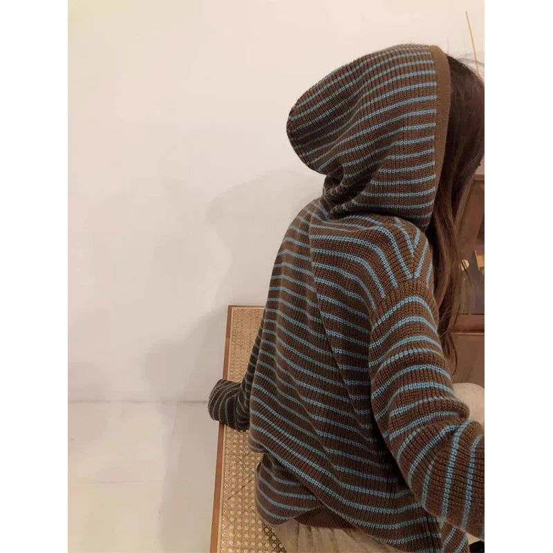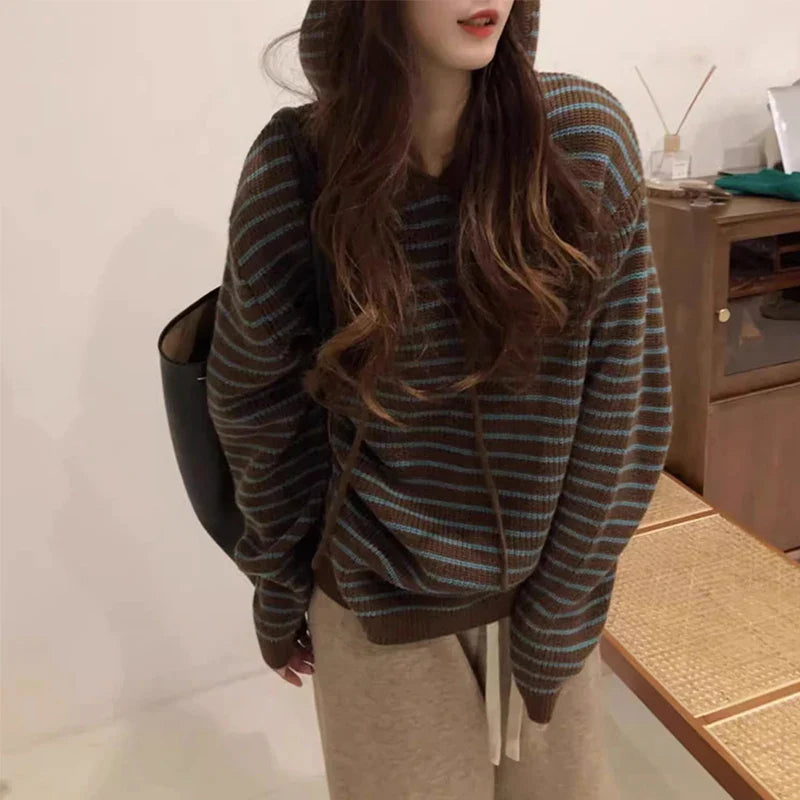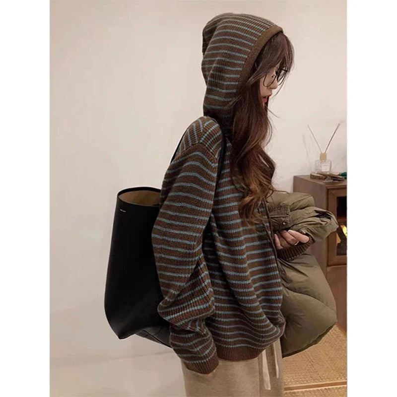 Vintage Hooded Sweater Women Harajuku Striped Knitted Pullovers Fall Winter Streetwear Long Sleeve Knitwear Korean Jumpers