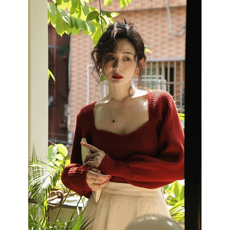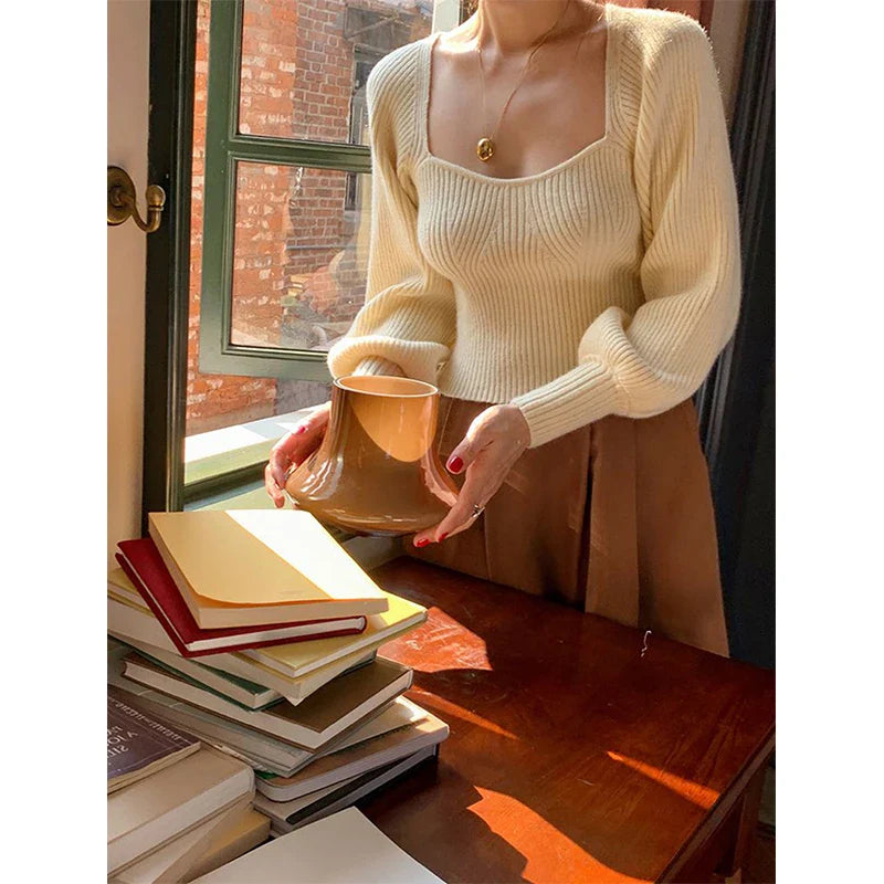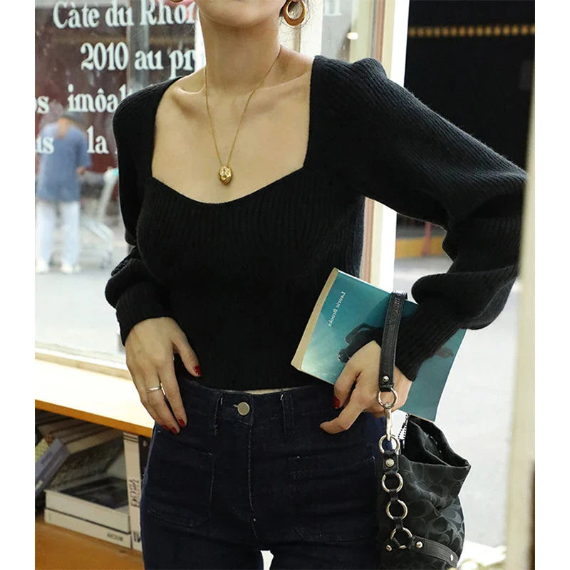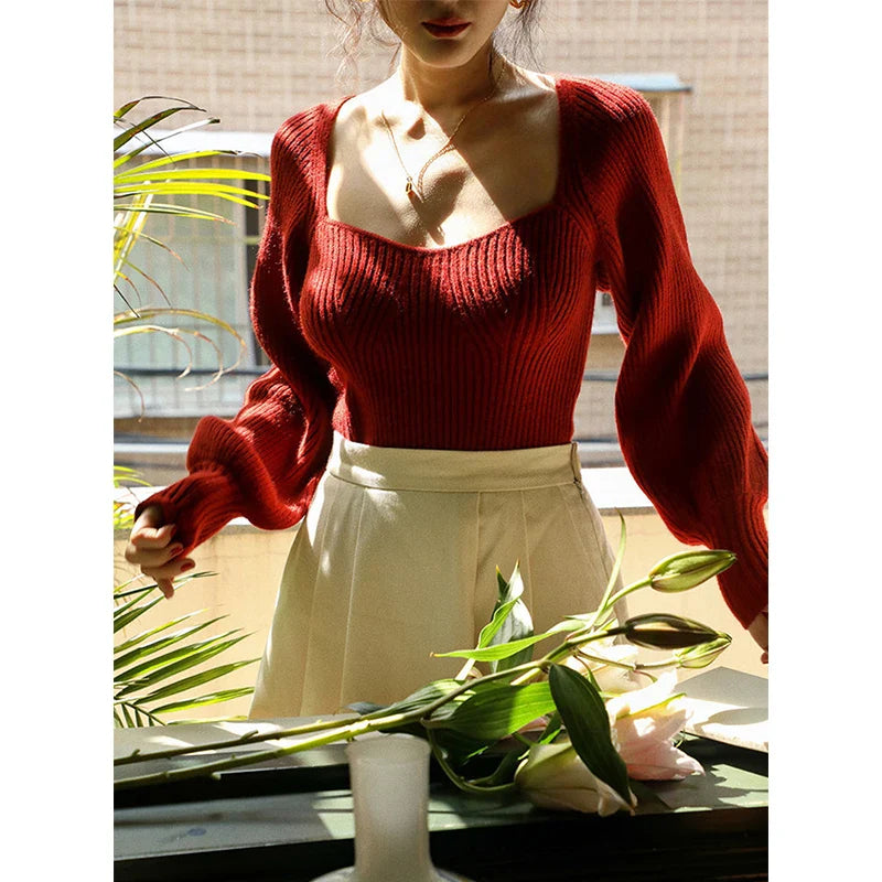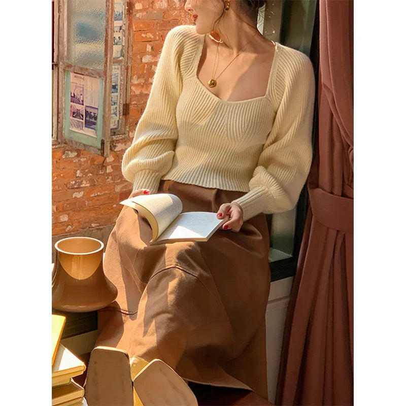 Vintage Square Neck Sweater Women Elegant Solid Knitted Pullovers Korean Slim Knitwear Streetwear All Match Jumper Tops