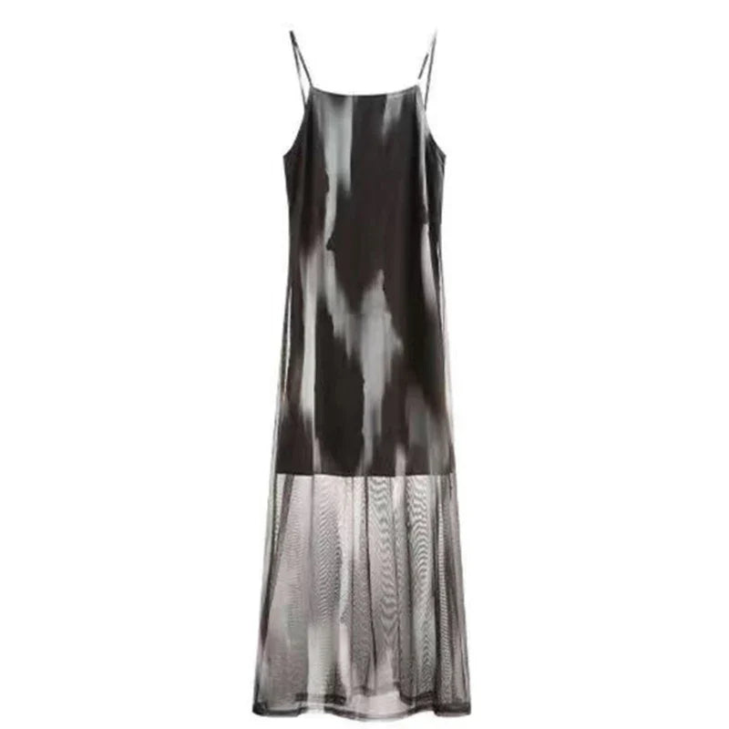 Y2K Tie Dye Midi Dress Women Spaghetti Strap Mesh Print A Line Dresses Vintage Streetwear Tulle Sleeveless Slim Vestidos
