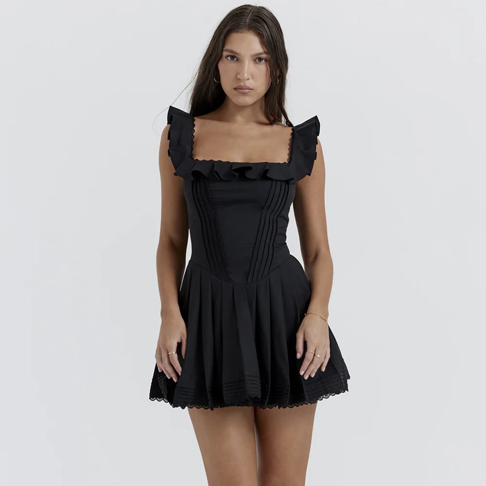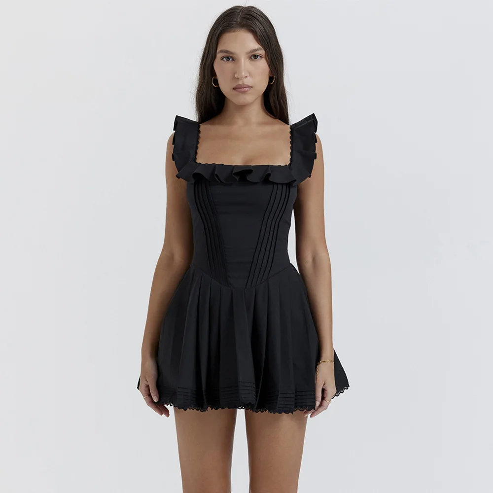 Black Square Neck Pleated Dress Mini Lovely Casual A Line Birthday Party Dresses Sexy Women Clothes