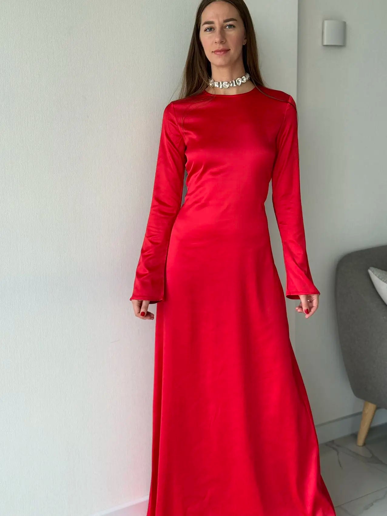 Long Maxi Evening Dress Red Satin Long Sleeve Formal Dresses Elegant Back Lace Up Party Dresses Women Clothing