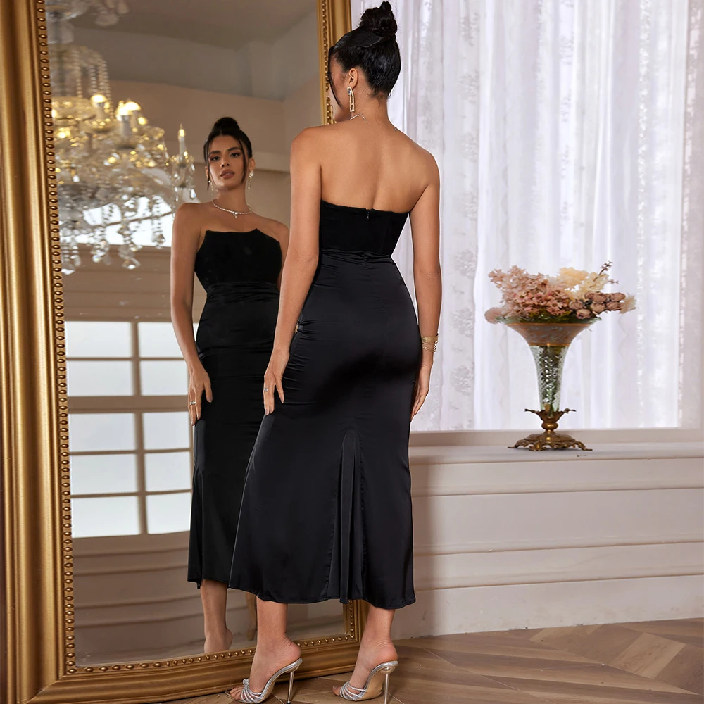 Maxi Strapless Formal Occasion Dresses Elegant Bodycon Corset Party Dresses Sexy Velvet and Satin Patchwork Dress