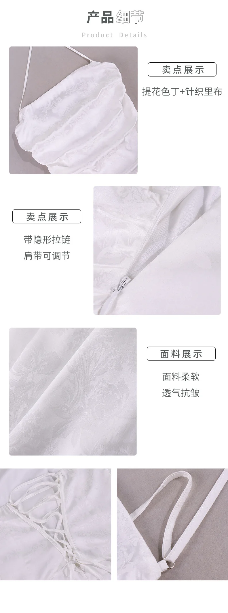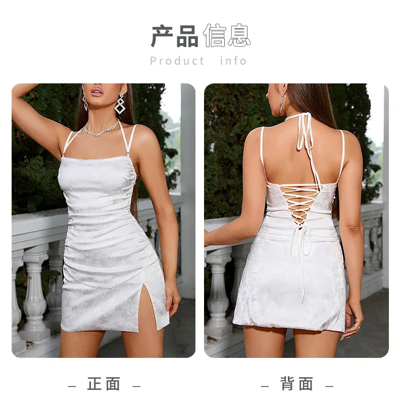 Spaghetti Strap Jacquard Satin Dress White Bodycon Birthday Party Dresses Mini Lace Up Summer Dresses Women