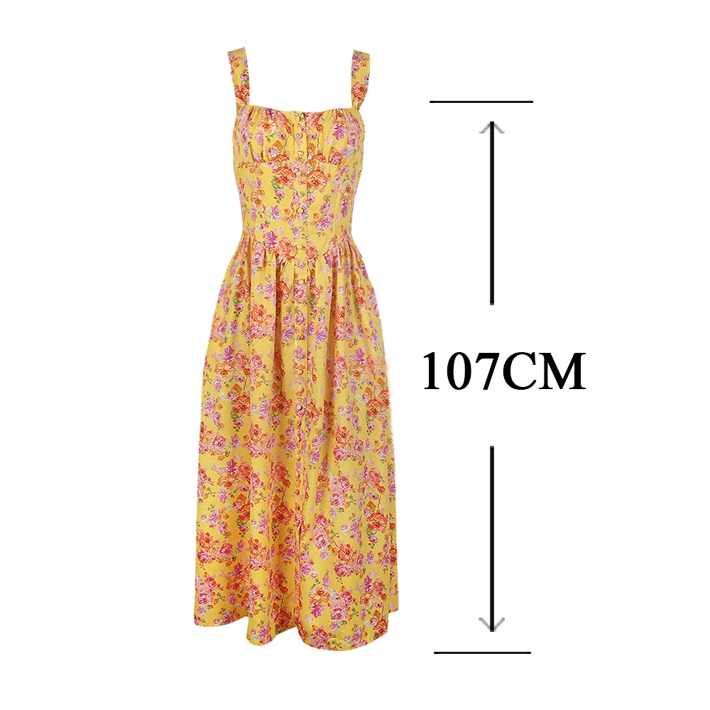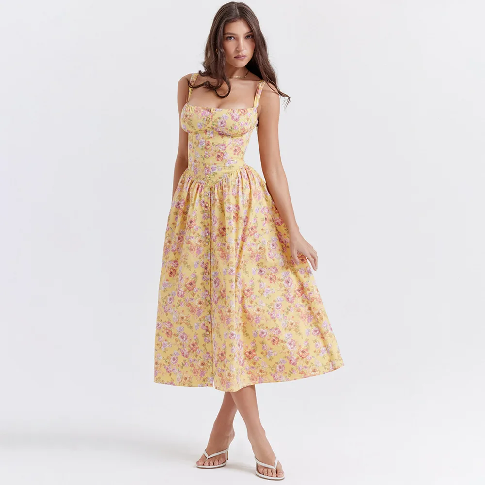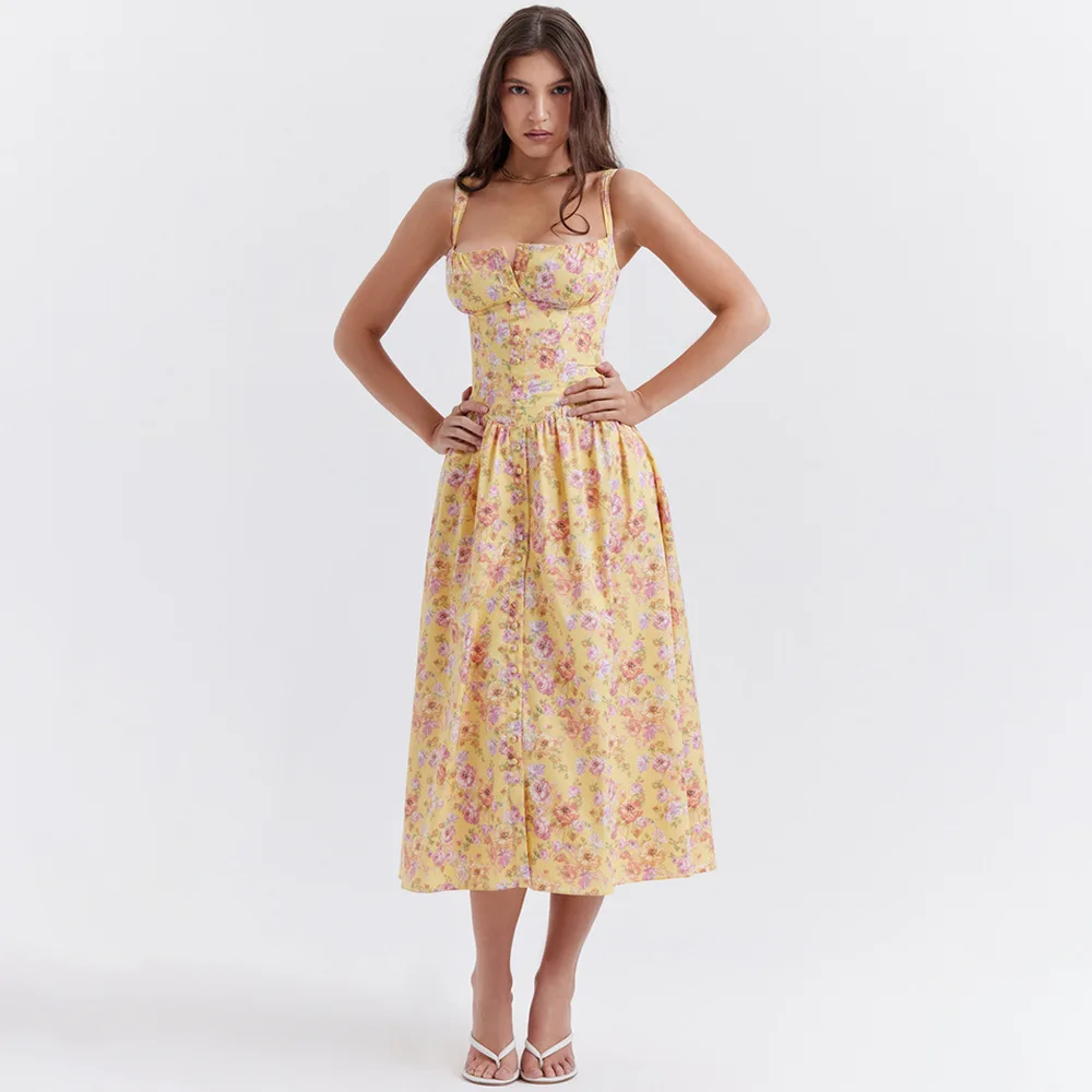 Summer Elegant Midi Dress Casual Pink Button Floral Print Holiday Party Long Dresses for Women New In Dresses