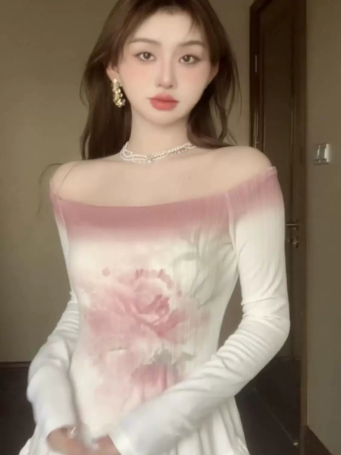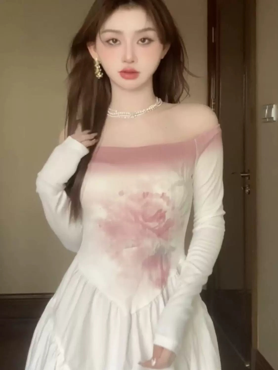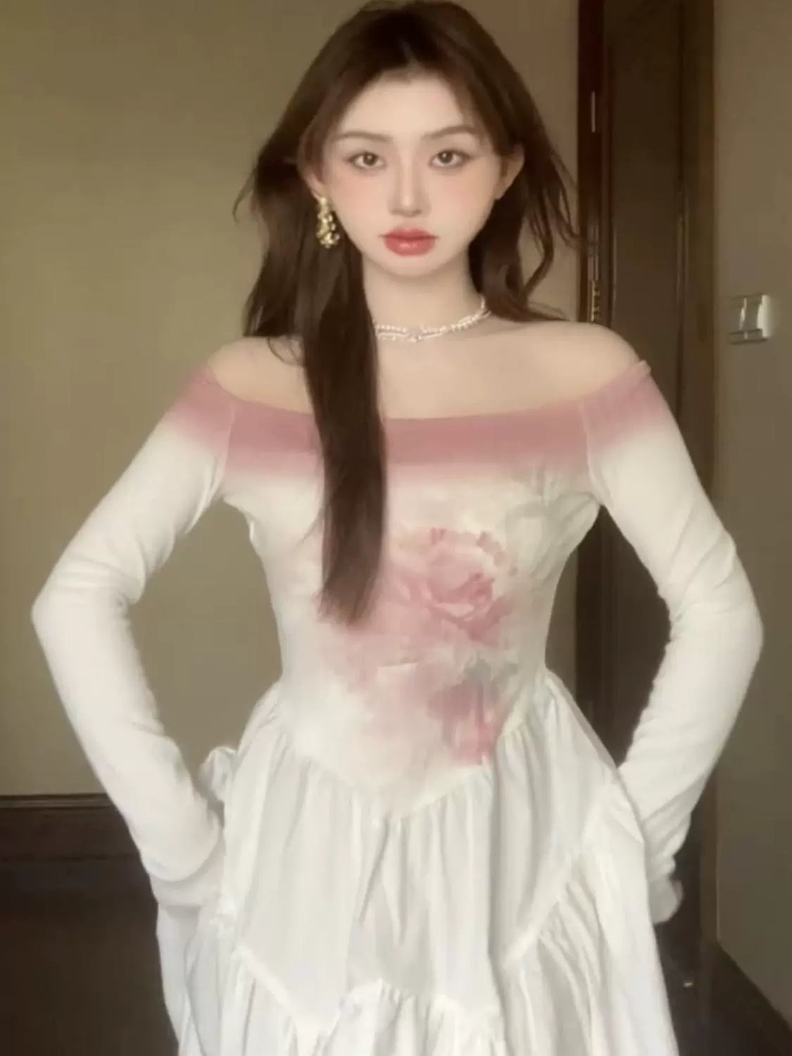 "Misty Kyoto" shoulder gradual change flower print long-sleeved dress women's autumn pit strip splicing big swing dress