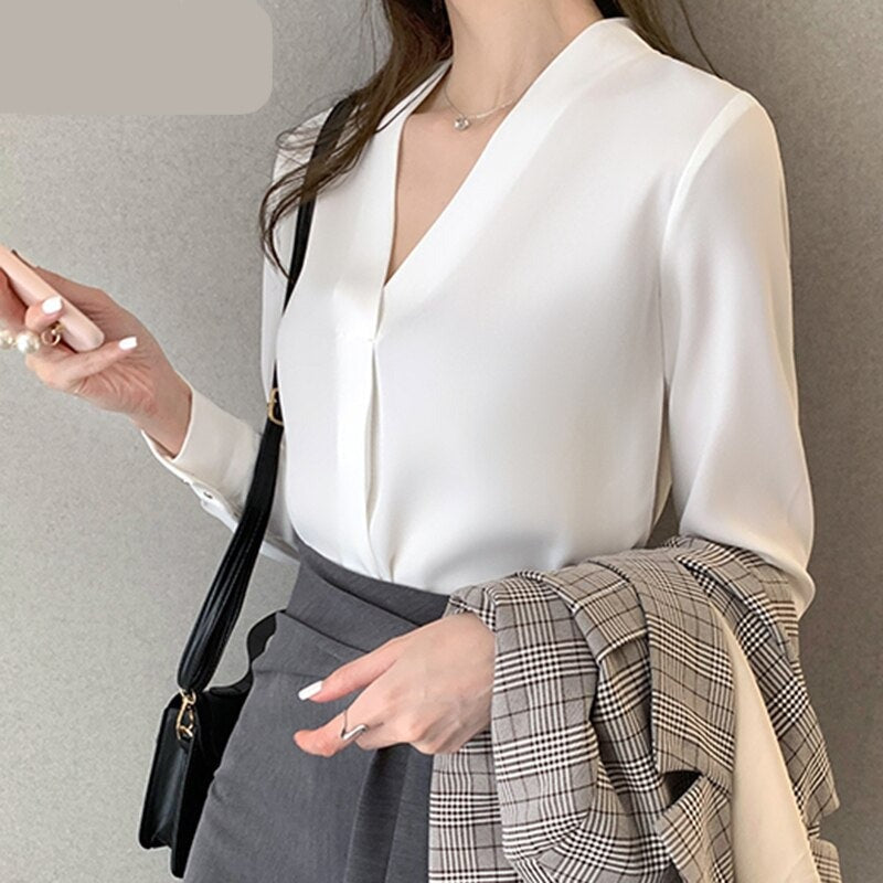 maoxiangshop New Chiffon White V-neck Women's Blouses Long Sleeve Spring High Street Shirt Ladies Top Chemisier S-XXL Solid Color