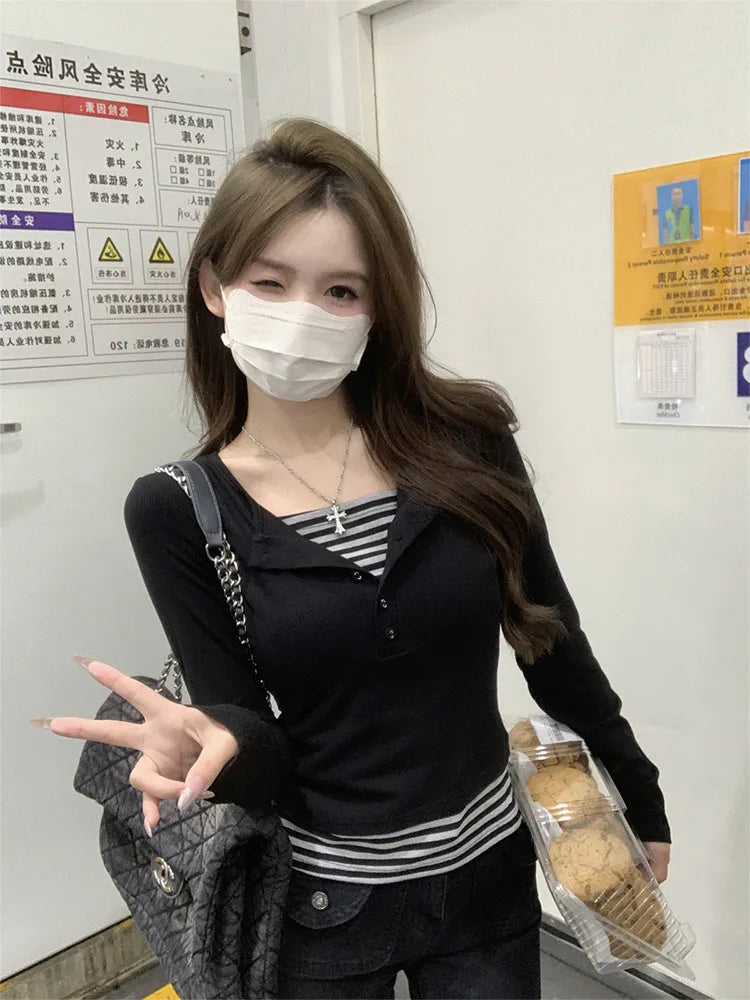 maoxiangshop New Design Fashion T-Shirts Women Square Collar Fake Two Pieces Striped Top Long Sleeve Slim Casual Tees American Retro Y2K