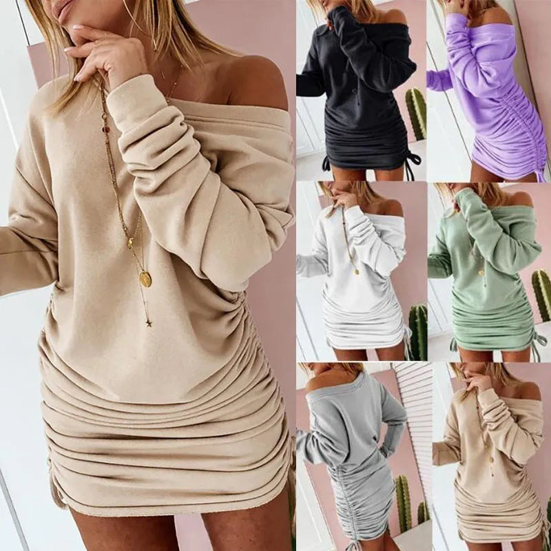 maoxiangshop New Dresses Women Mini Dress Ladies Casual Women's Dress Sexy Drawstring Pleated Long Sleeve Party Dress Sukienka