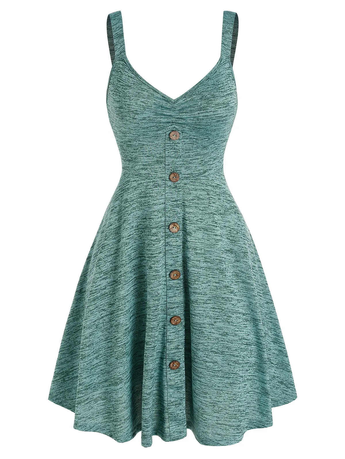 maoxiangshop New Fashion Open Back Mini Flare Sleeveless Space Dye Mock Button Mini Daily Dress V-Neck High Stretch Women Dresses