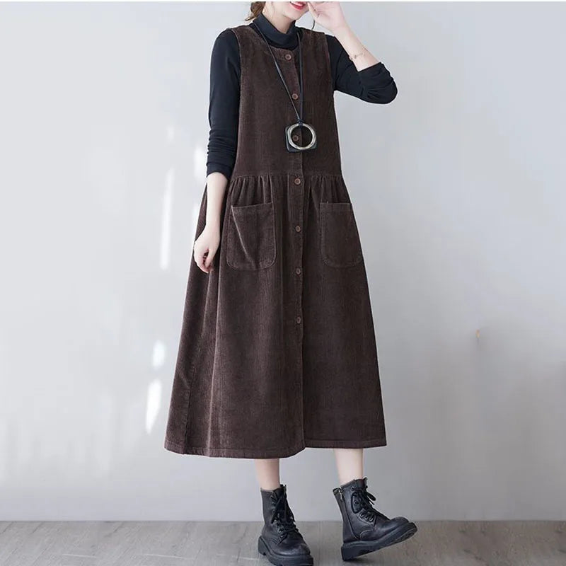 maoxiangshop New Spring Autumn Womens Corduroy Dress Vestidos Retro Fashion Femal Long Casual Dresses Single-Breasted Sleeveless Vest Dresses