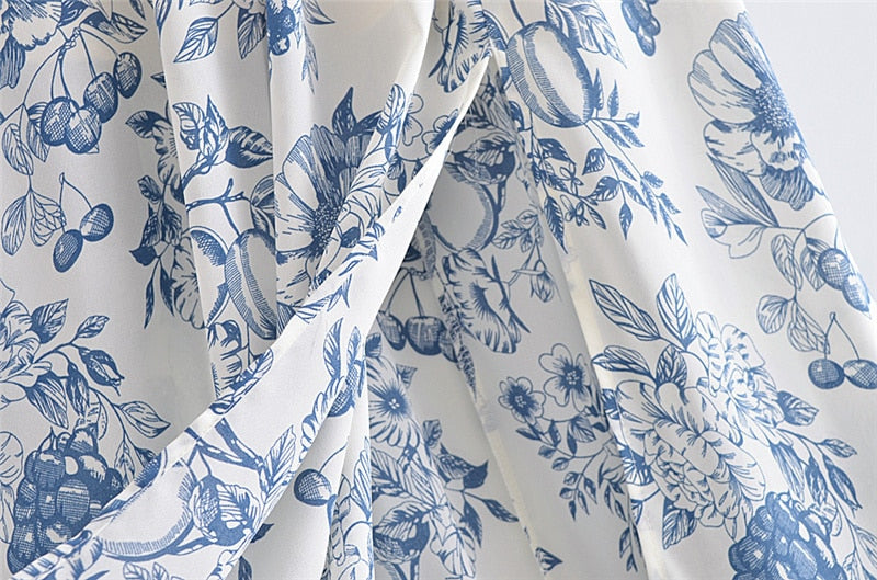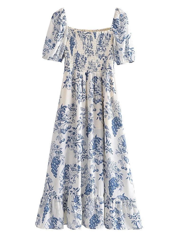 maoxiangshop New Summer Women Vintage Fruit Floral Print Square Neck Puff Sleeves Elastic Sexy Side Slit Long Midi Dress