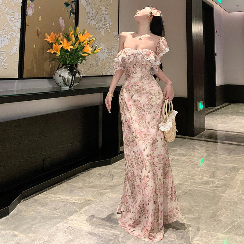 One-word shoulder floral coffee break dress women's summer vacation gentle wind long dress waist beautiful temperament skirt