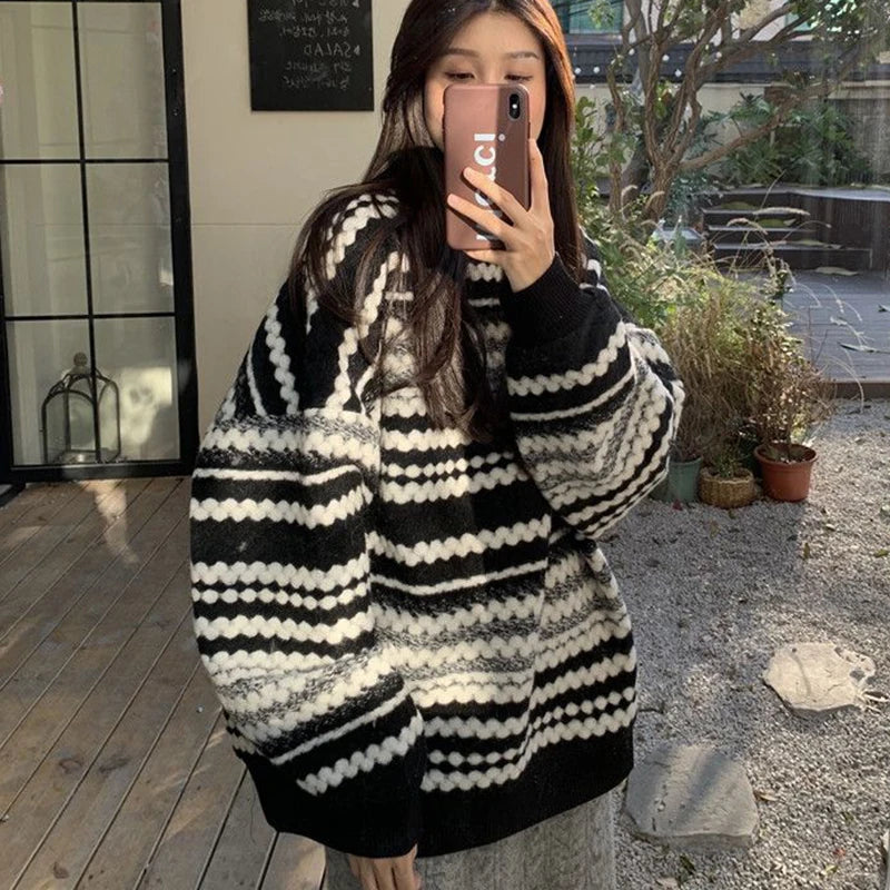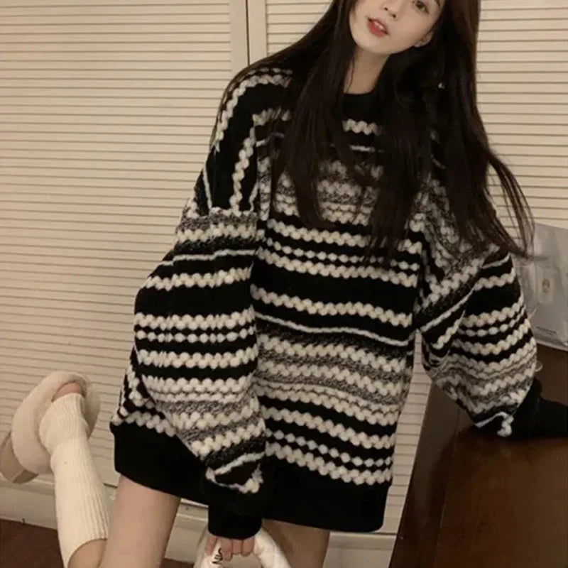 Oversized Sweater Women Autumn Vintage Streetwear Striped Loose Long Sleeve Pullover Harajuku All Match Casual Midi Jumpers