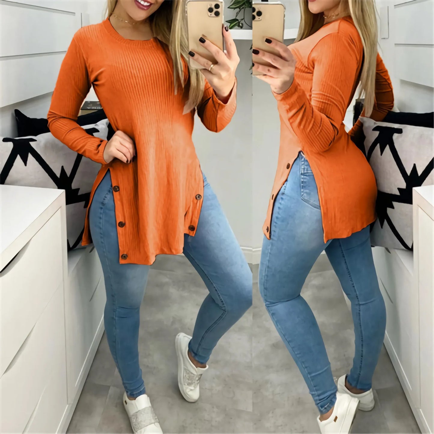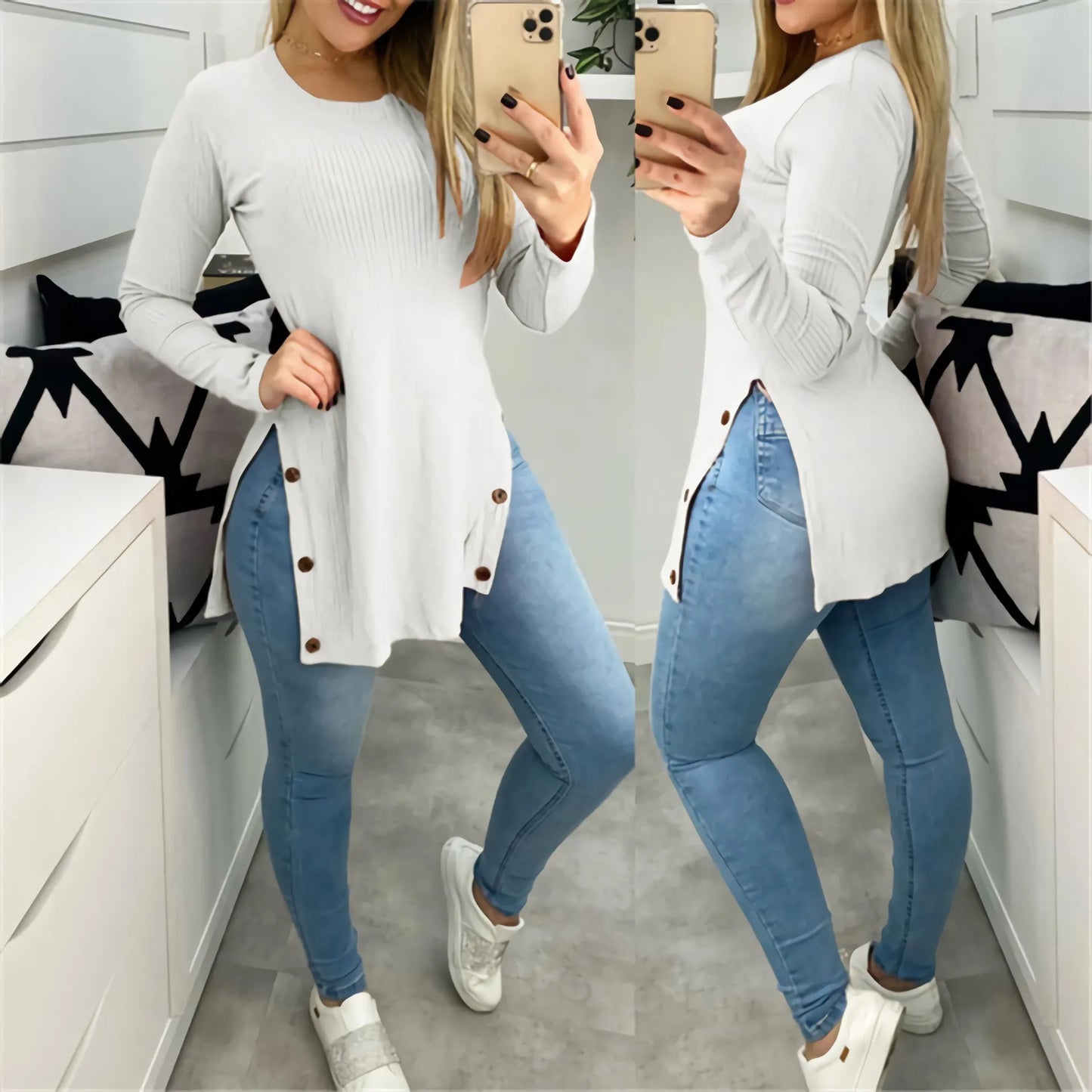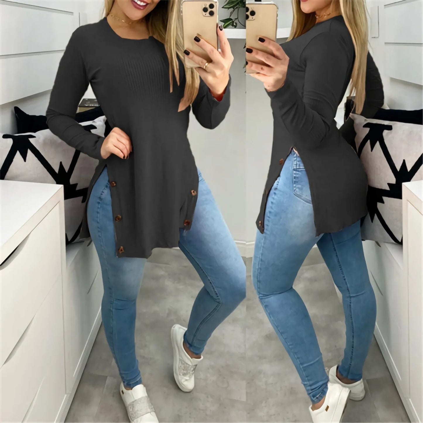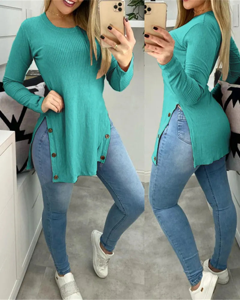 maoxiangshop Pit strip solid color round neck slit button long sleeve T-shirt large size women's blouse