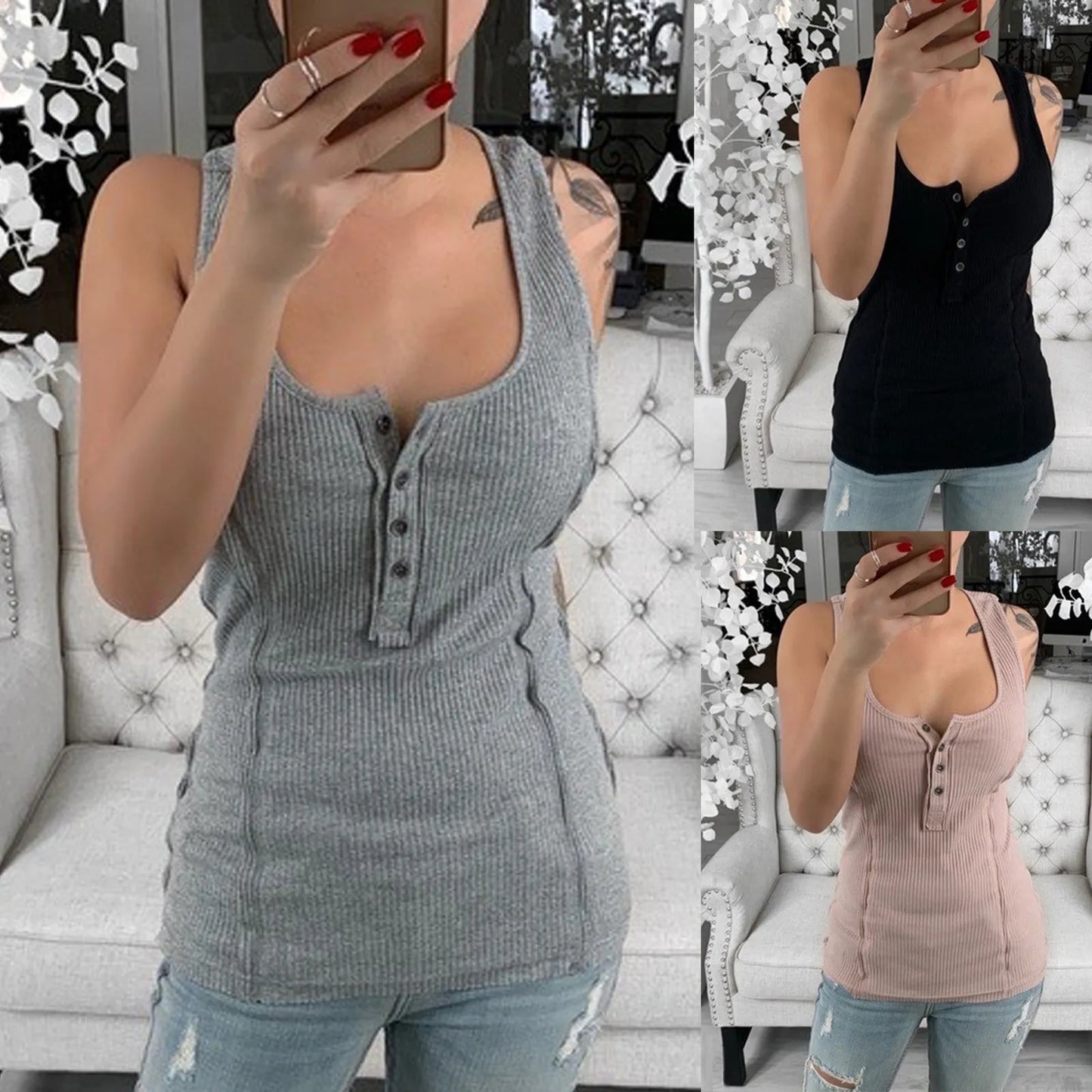 maoxiangshop Plus Size Fashion Womens Round Neck Sleeveless Camisole Button Solid Color Vest Blouse Easy Tops New Fashion Simple Women'S Top