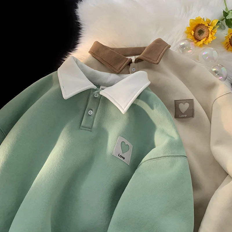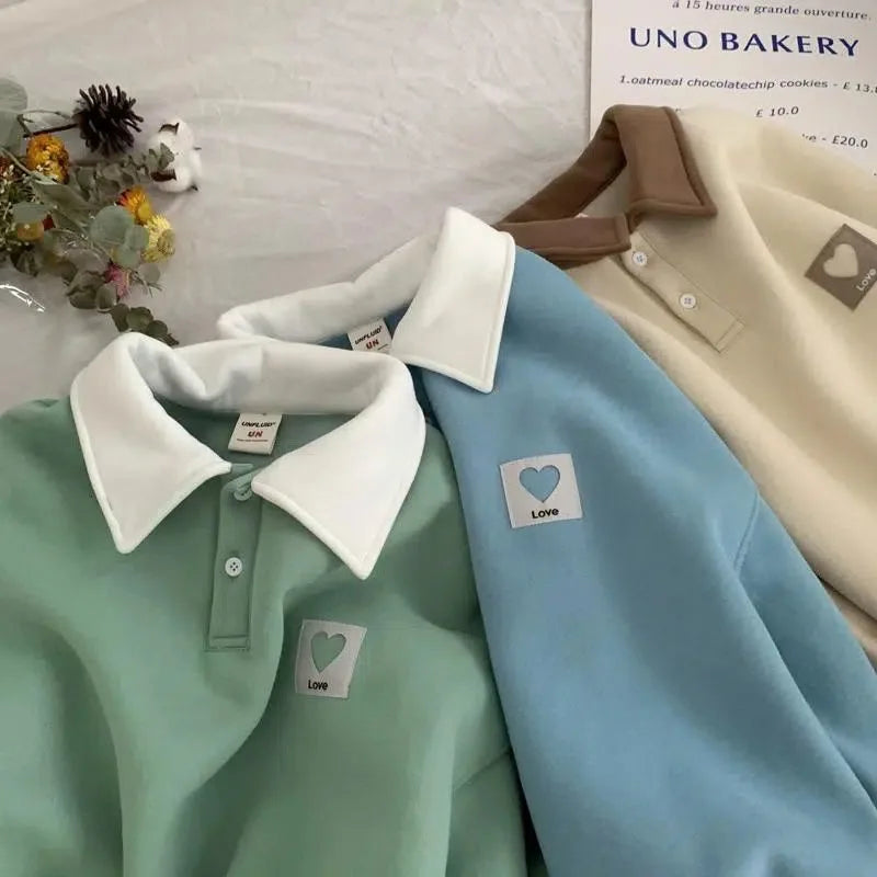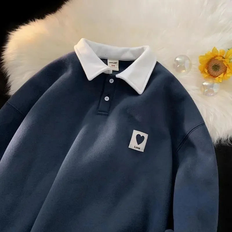 maoxiangshop Polo Collar Hoodies Heart Pattern Women Sweatshirt Thick Warm Autumn Vintage Female Hoodies Casual Long Sleeve Oversized Tops