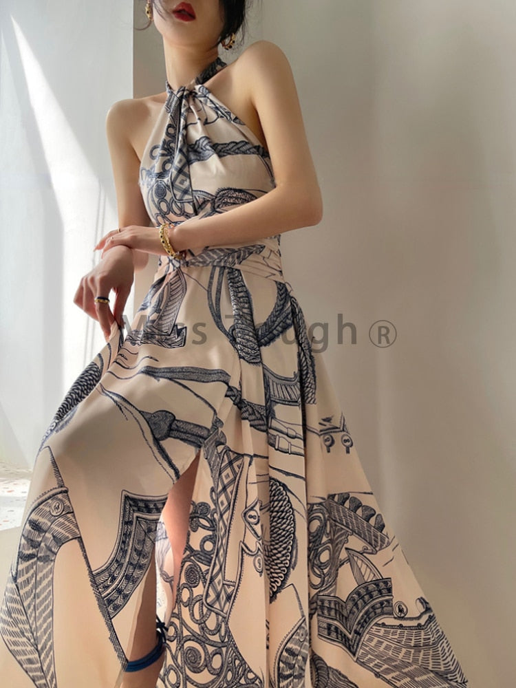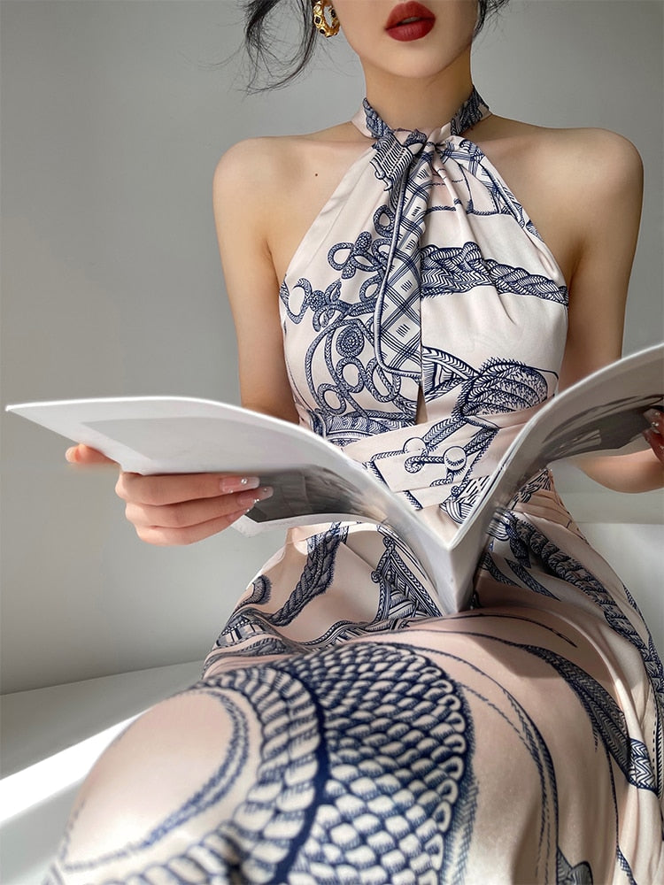 maoxiangshop Print France Vintage Elegant Dress Women Sleeveless Halter Sexy Korean Retro Dresses Designed Evening Party Long Dress New