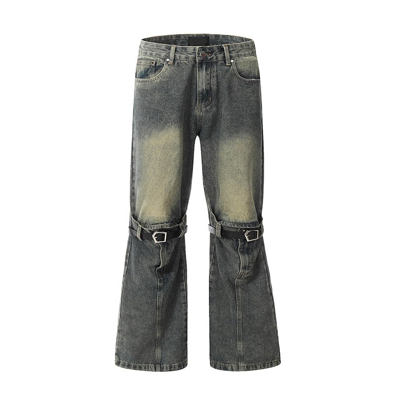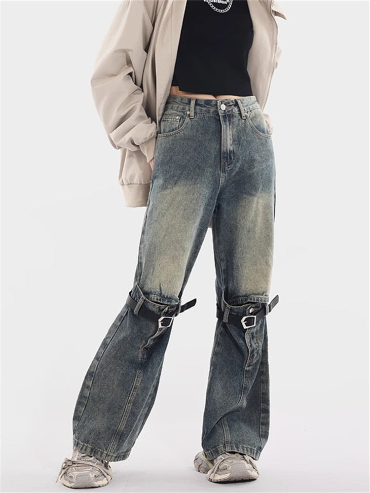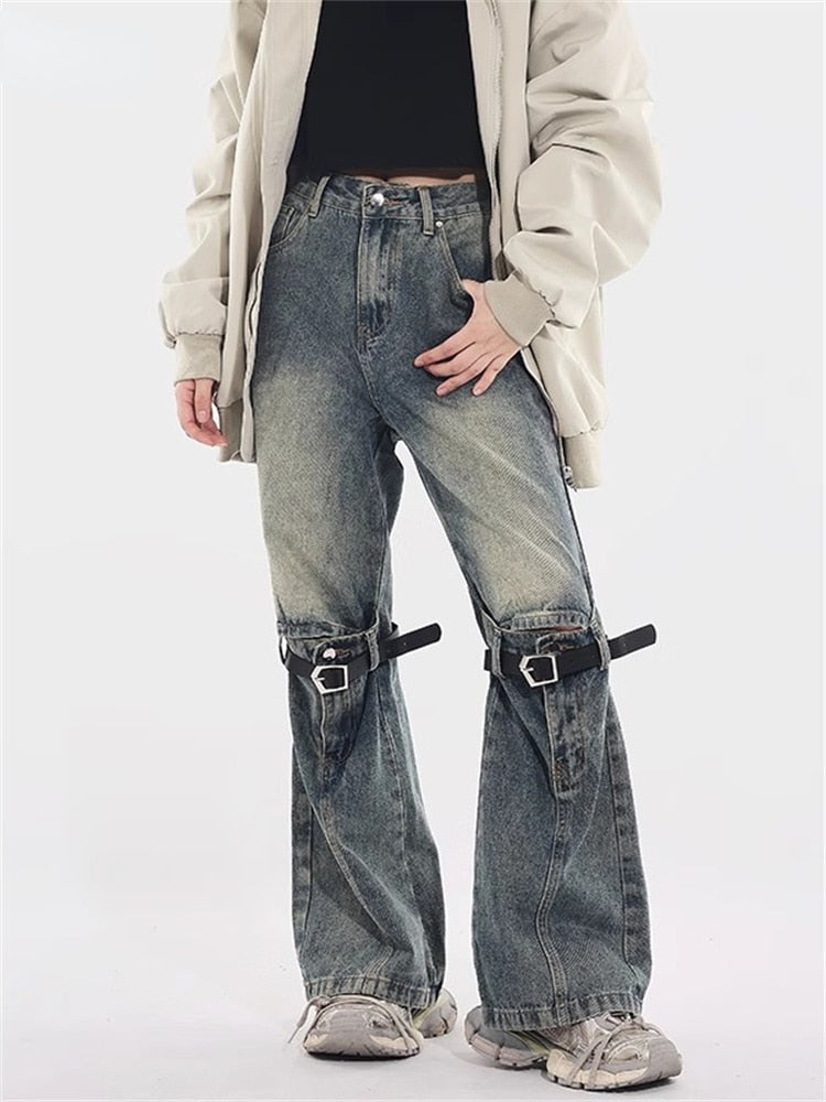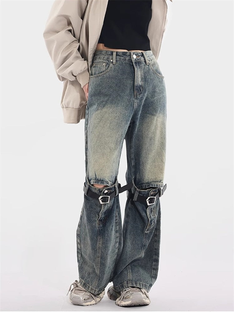QWEEK Harajuku Retro Blue Jeans Women Y2K Streetwear Hollow Out Denim Pants Oversized 90s Vintage Hippie Punk Wide Leg Trousers