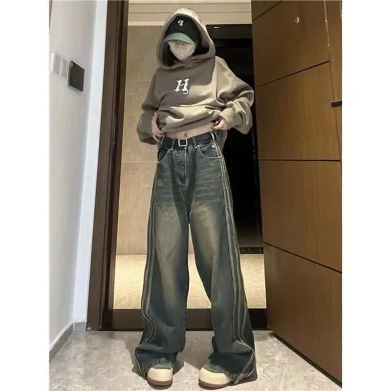 Retro Blue High Waist Baggy Jeans Women Autumn Pocket Wide Leg Denim Trousers Woman Streetwear Loose Straight Pants