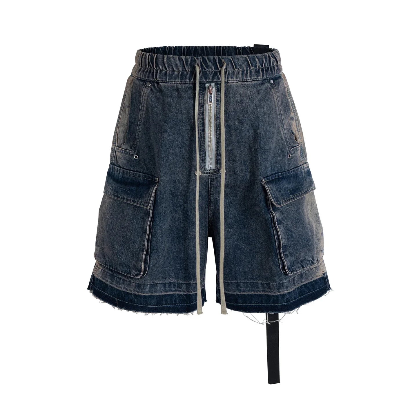 Ribbons Streetwear Multi-pockets Cargo Short for Men Elastic Waist Wide Leg Baggy Jeans Knee Length Pants Loose Overall