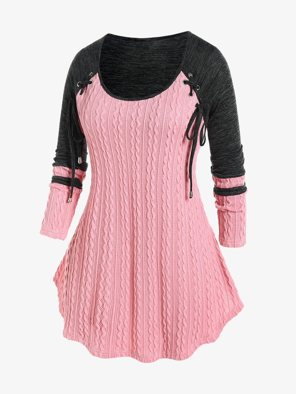 Model Number: Plus Size Colorblock Cable Knit Panel Lace Up Tee