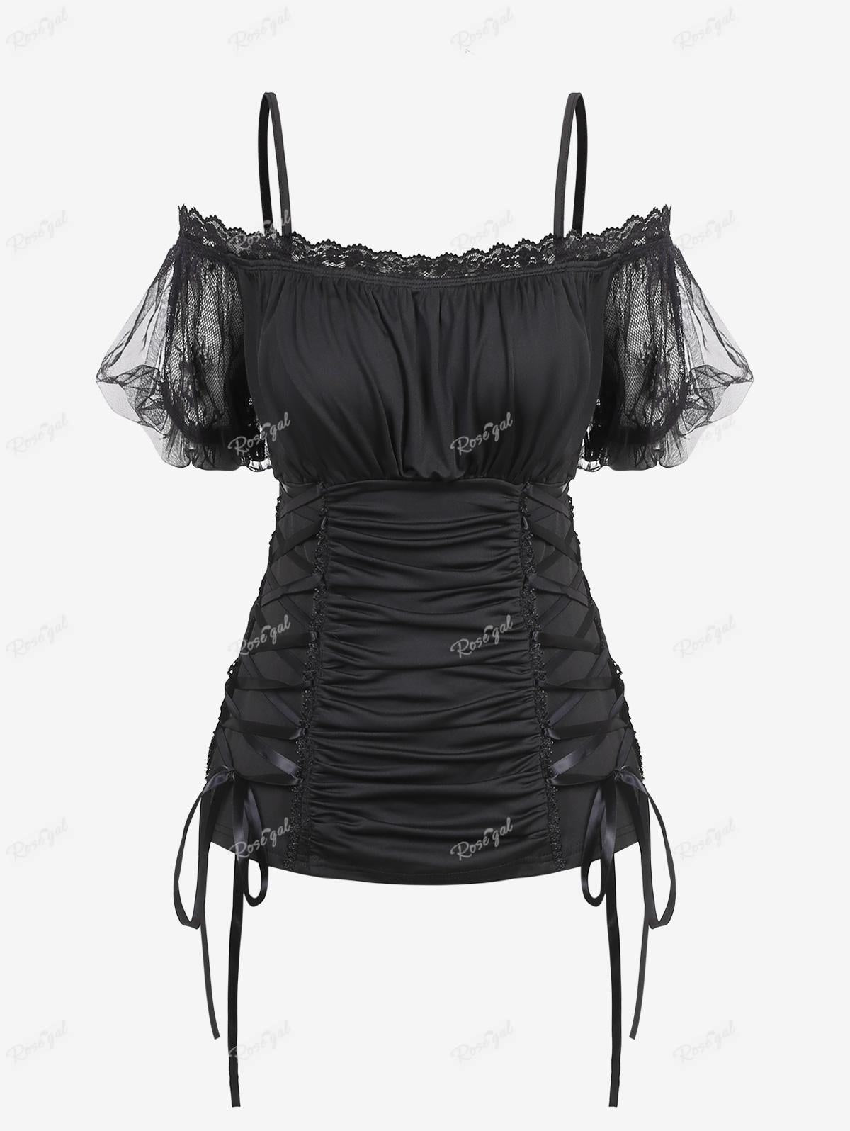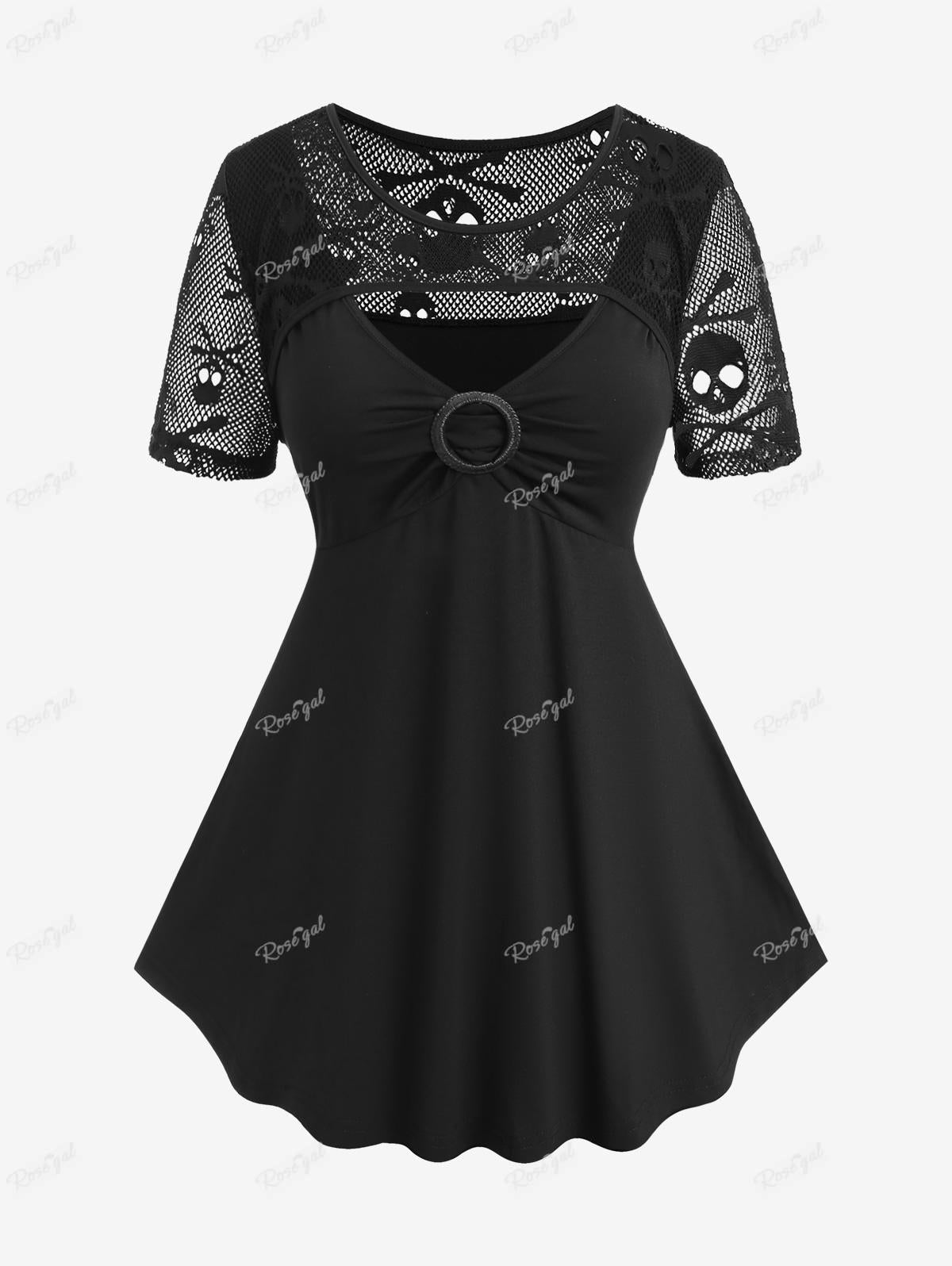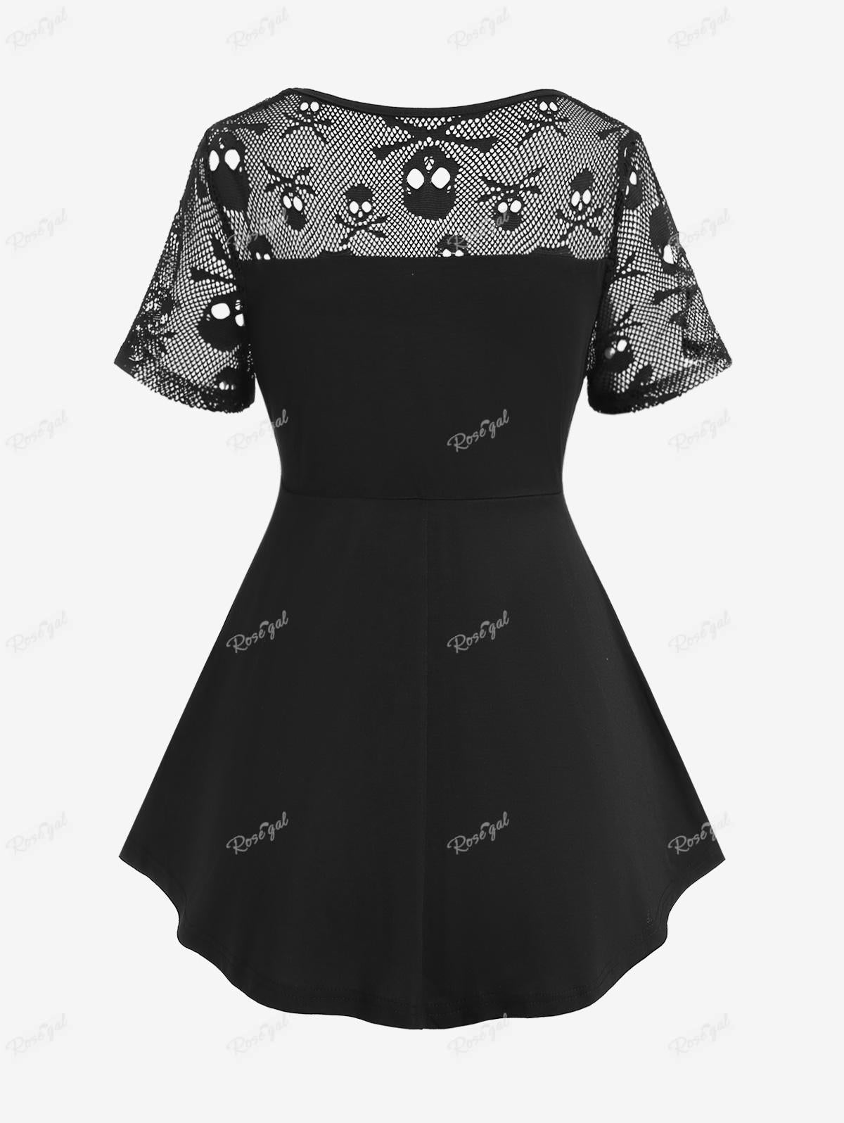maoxiangshop Plus Size Gothic Skull Mesh Panel Cutout T-shirt Black Round Neck Short Sleeve Blouse Tops For Women Halloween