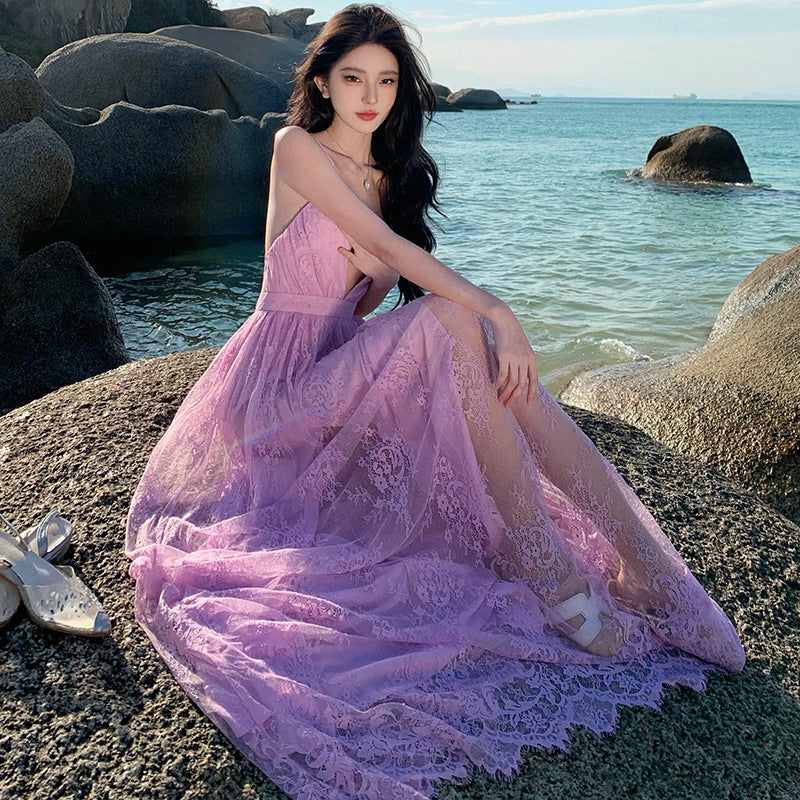 Sanya beach skirt suspender deep V-neck sexy backless lace mesh dress vacation wind elegant travel photo dress