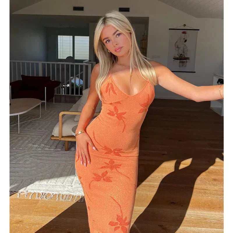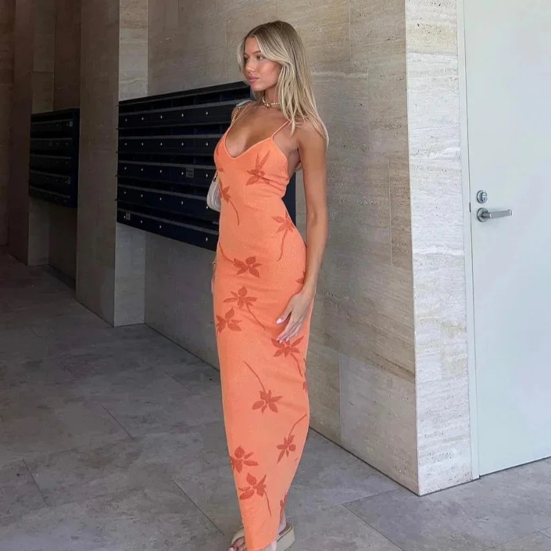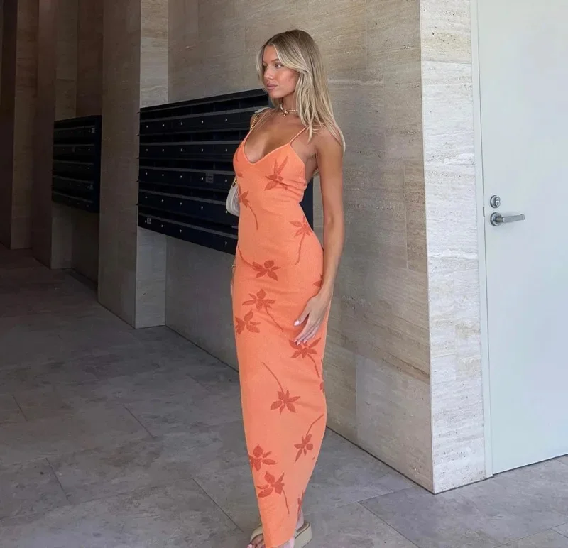 Sexy Thin Knitted Print Sling Maxi Dressess Women Fashion Backless Off Shoulder V Neck Lady Club Dress Elegant Slim Long Robes