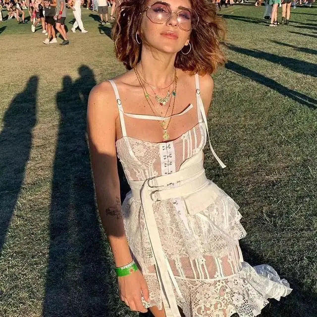 Sexy White Irregular Lace Spaghetti Strap Long Dress Women Summer See Through Mini Dress Lady Club Y2k Patchwork Runway Dress