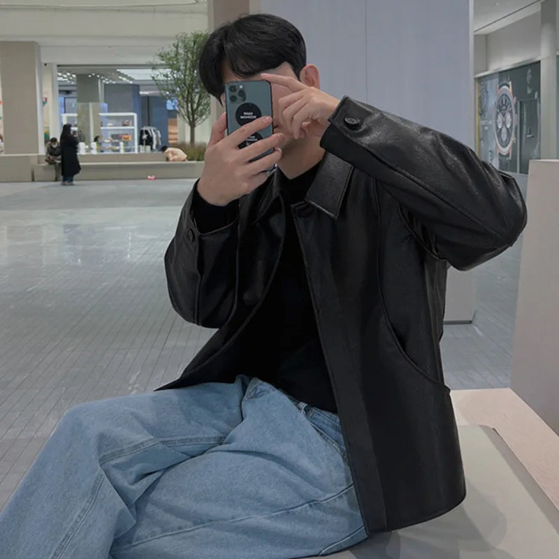 Short Motorcycle Pu Leather Coat Trend Men's Autumn New Korean Style High End Lapel Loose Jacket Fashion Streetwear