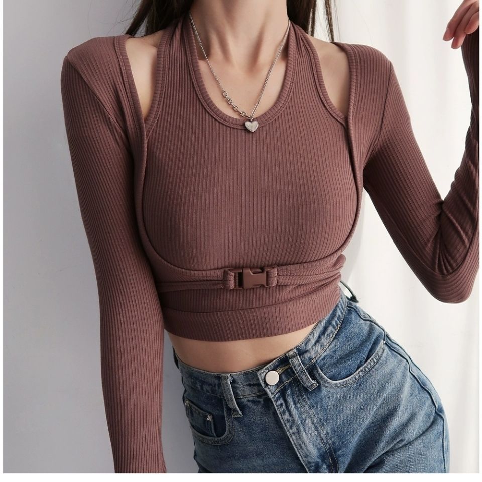 Slim Fit Long Sleeve T-shirts Women Solid Stylish S-3XL Simple Chic Halter Fake-two Pieces Crop Tops Female All-match Fashion