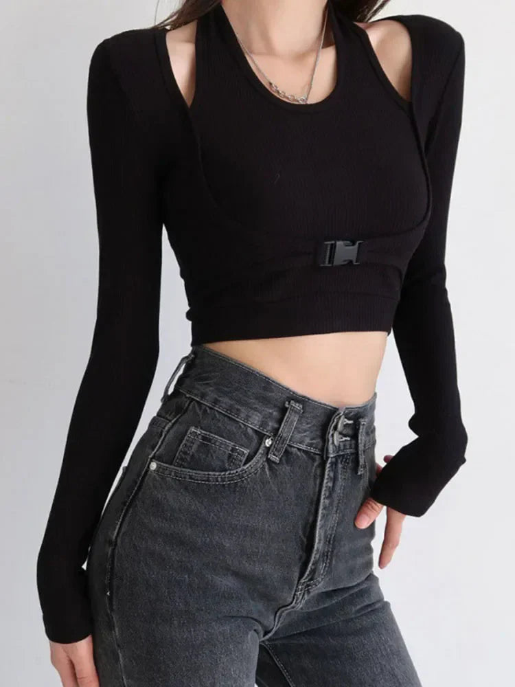 Slim Fit Long Sleeve T-shirts Women Solid Stylish Simple Chic Halter Fake-two Pieces Crop Tops Female All-match Fashion