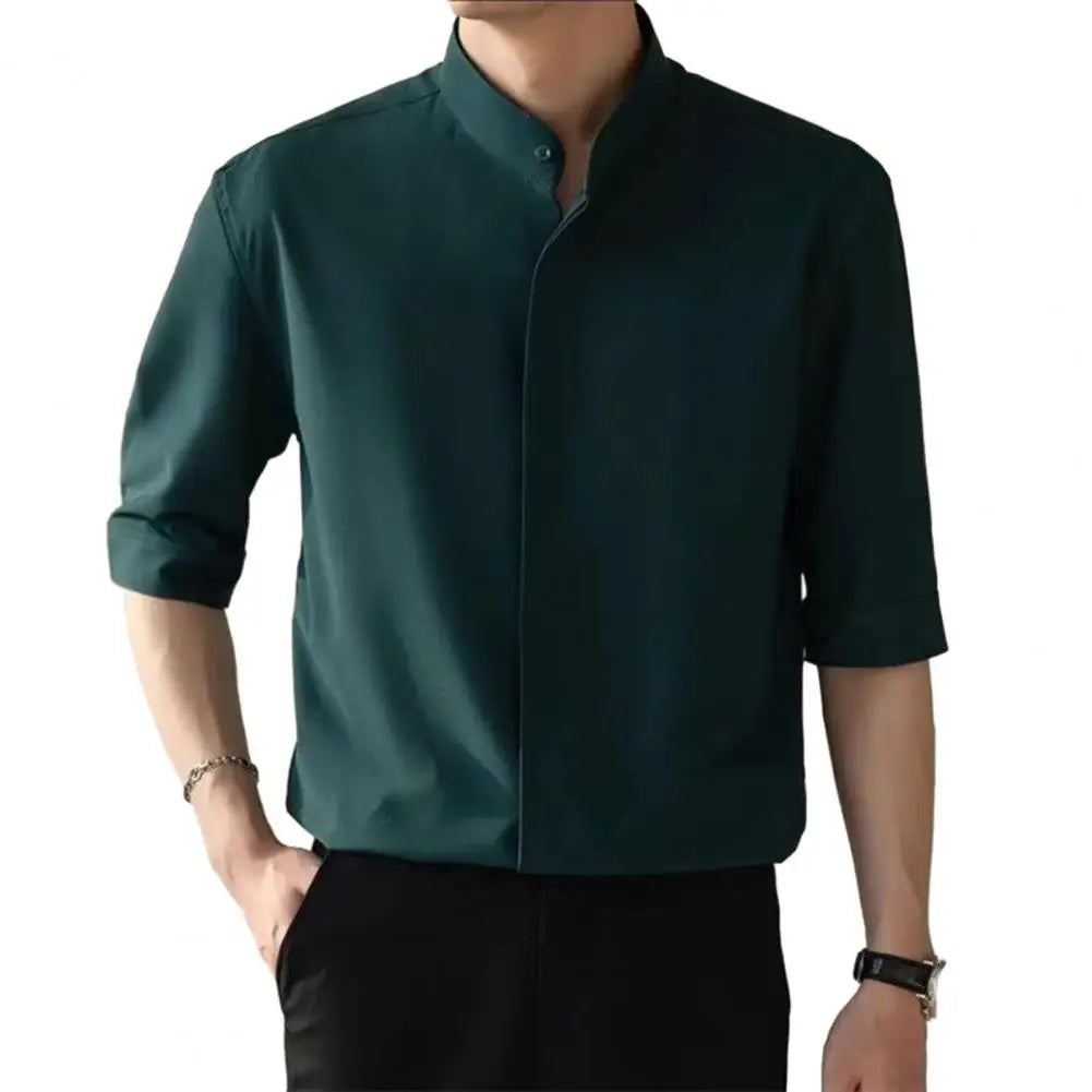 Slim Fit Stand Collar Shirt Men Solid Color Shirt Stylish Stand Collar Men's Shirt for Business Commute Office Slim Fit Half