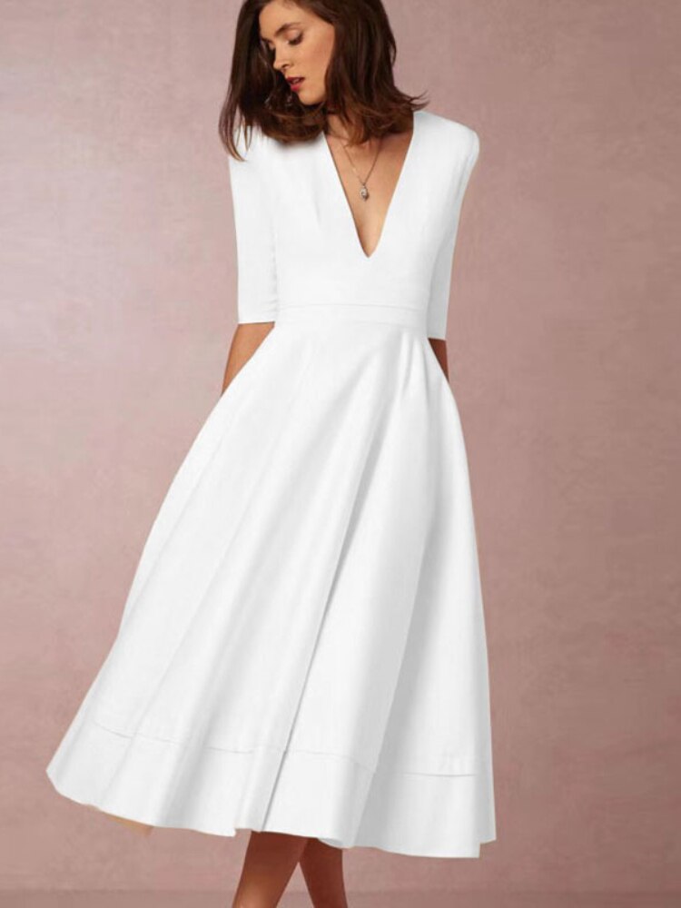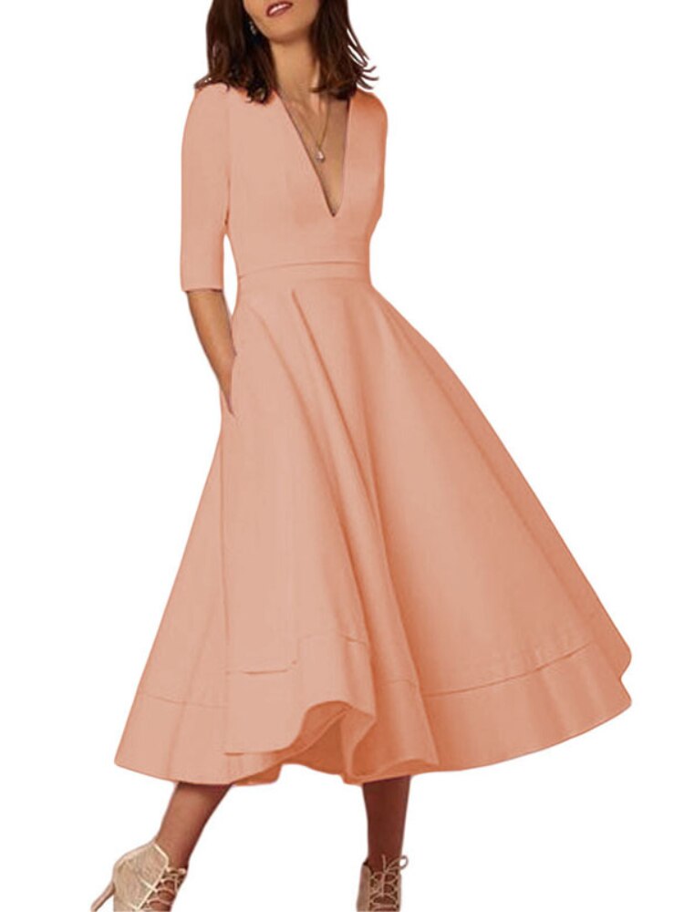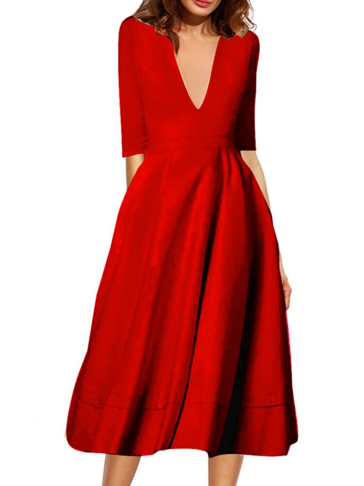Spring and Summer New Ladies High-end Sexy Deep V Mid-sleeve Dress Retro Temperament Mid-length Solid Color Dress Female