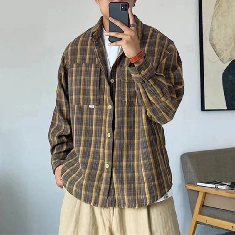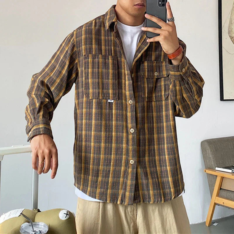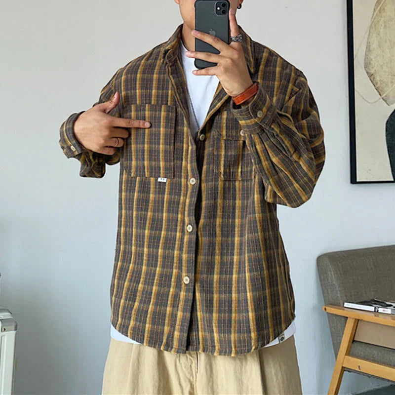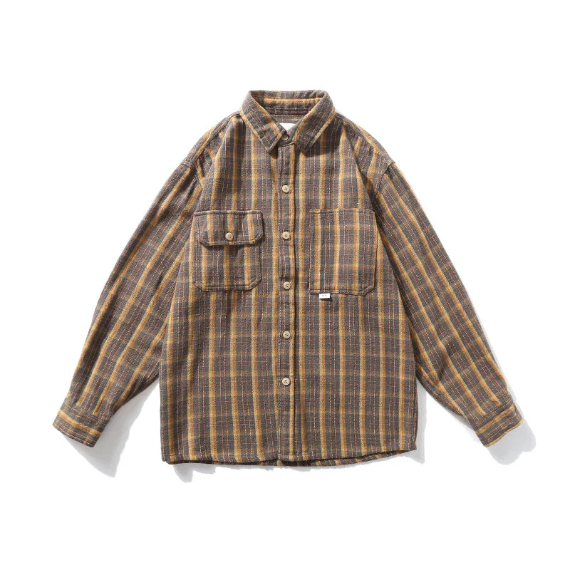 maoxiangshop Spring Autumn Korean Style Casual High Quality Khaki Plaid Shirt Men Clothing Harajuku Coats Japanese Streetwear Vintage Clothes