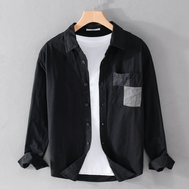 maoxiangshop Spring Autumn Solid Long Sleeve Shirt Men Clothing Turn-down Collar Loose Casual Cardigan Man Simple Printed Pocket Tops