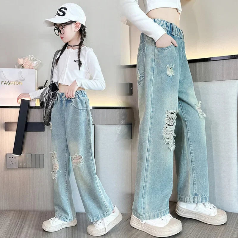 Spring Autumn Teenage Girls Denim Wide Leg Pants Children Straight Ripped Trousers Medium Girls Loose Breathable Solid Jeans