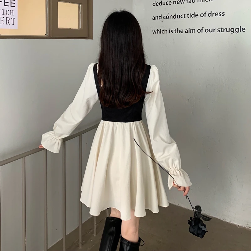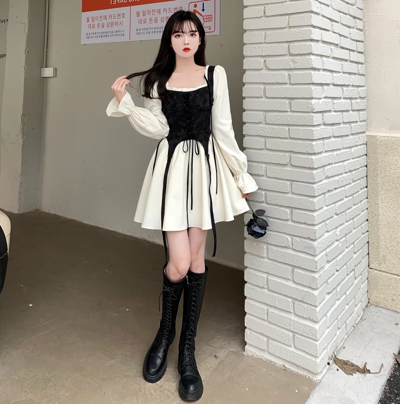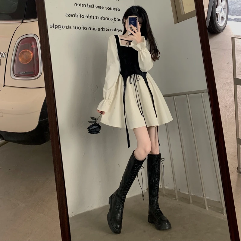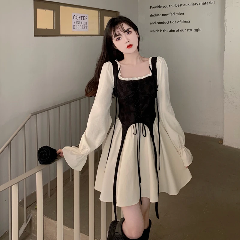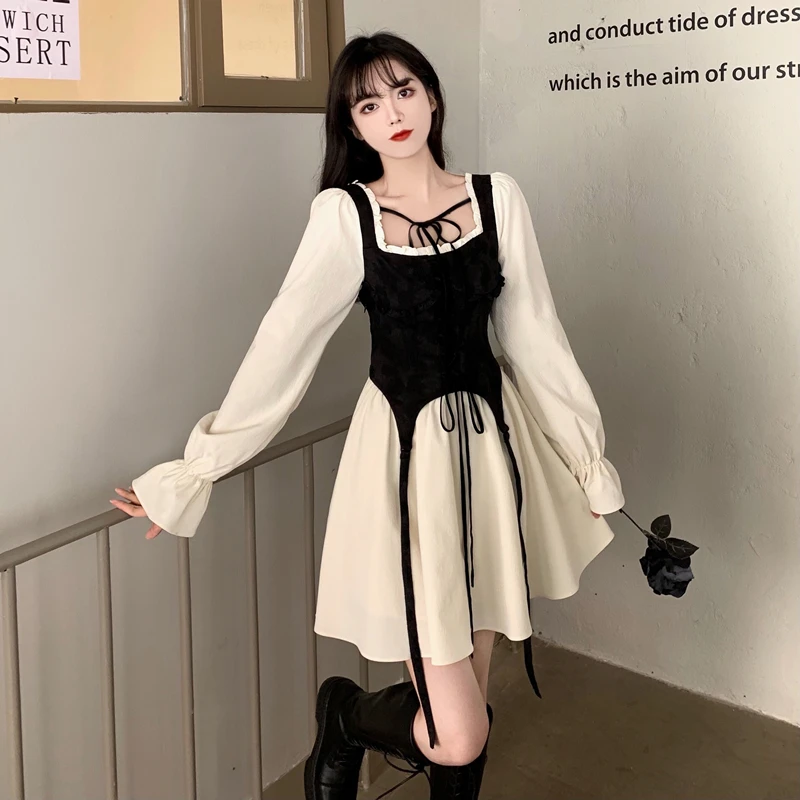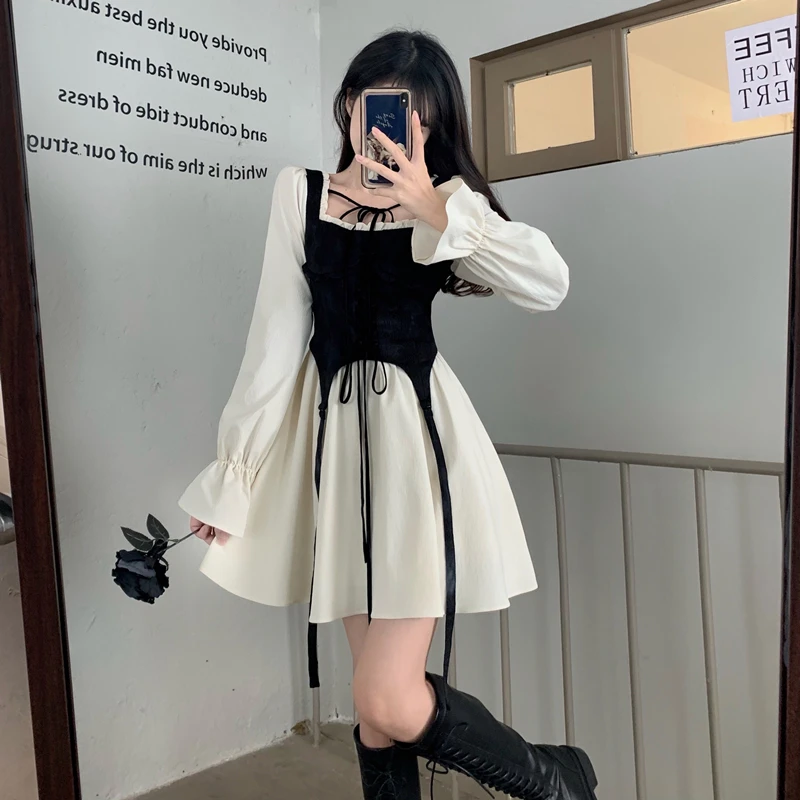 maoxiangshop Spring Autumn Vintage Patchwork Y2k Sweet Kawaii Party Dresses for Women Casual Lace Up Bow Harajuku Long Sleeve Club Mini Dress