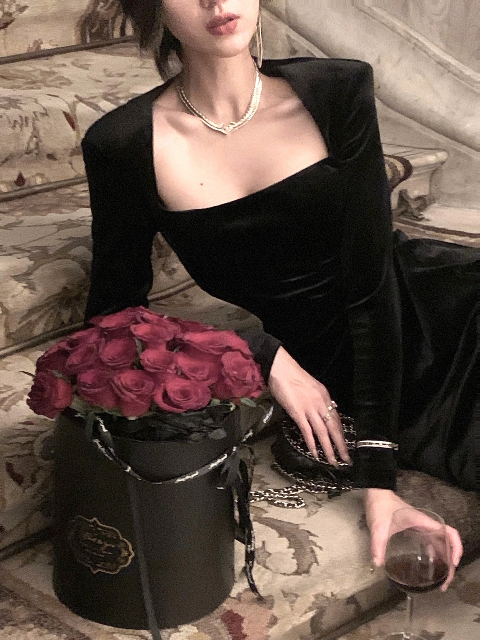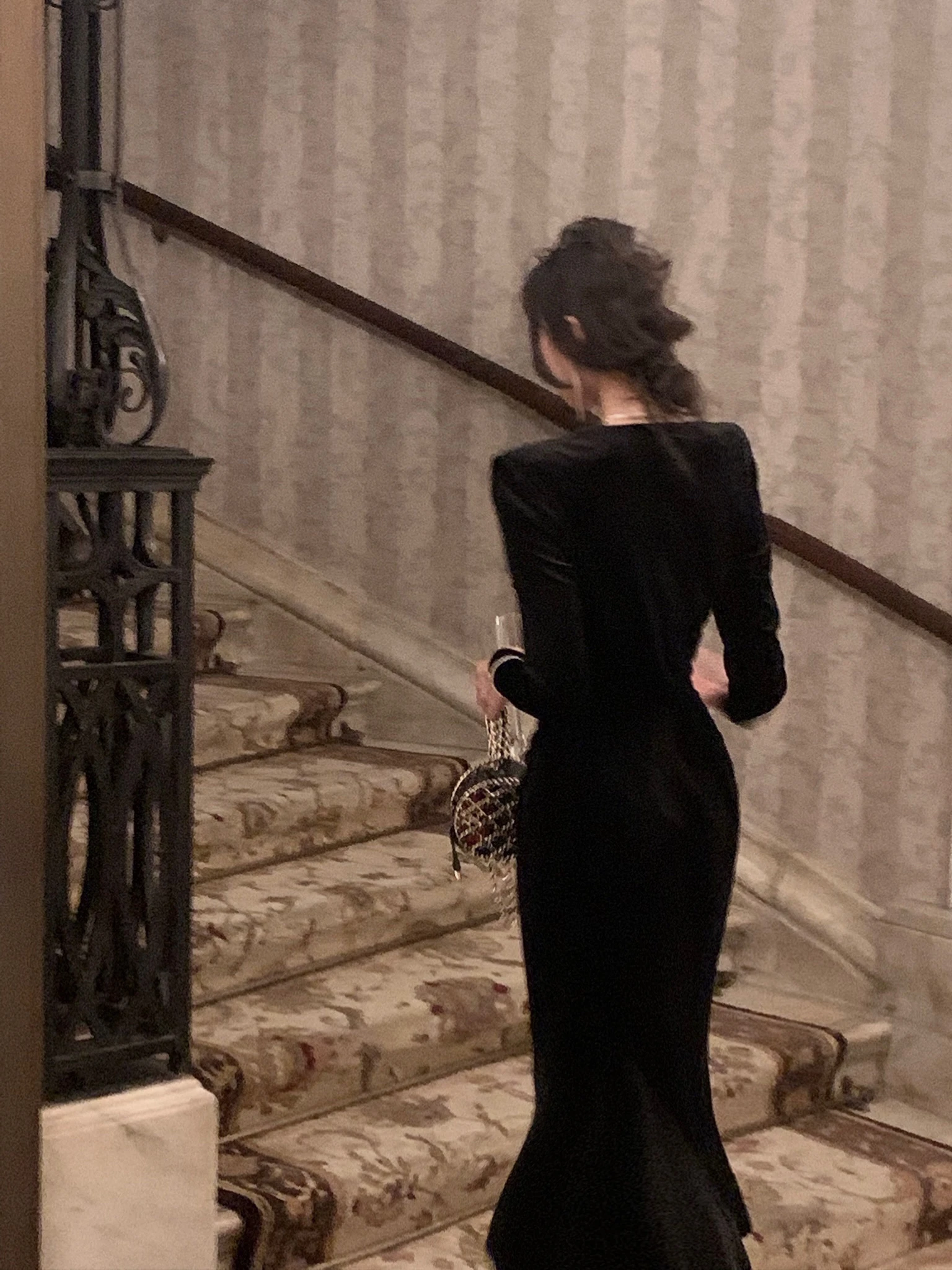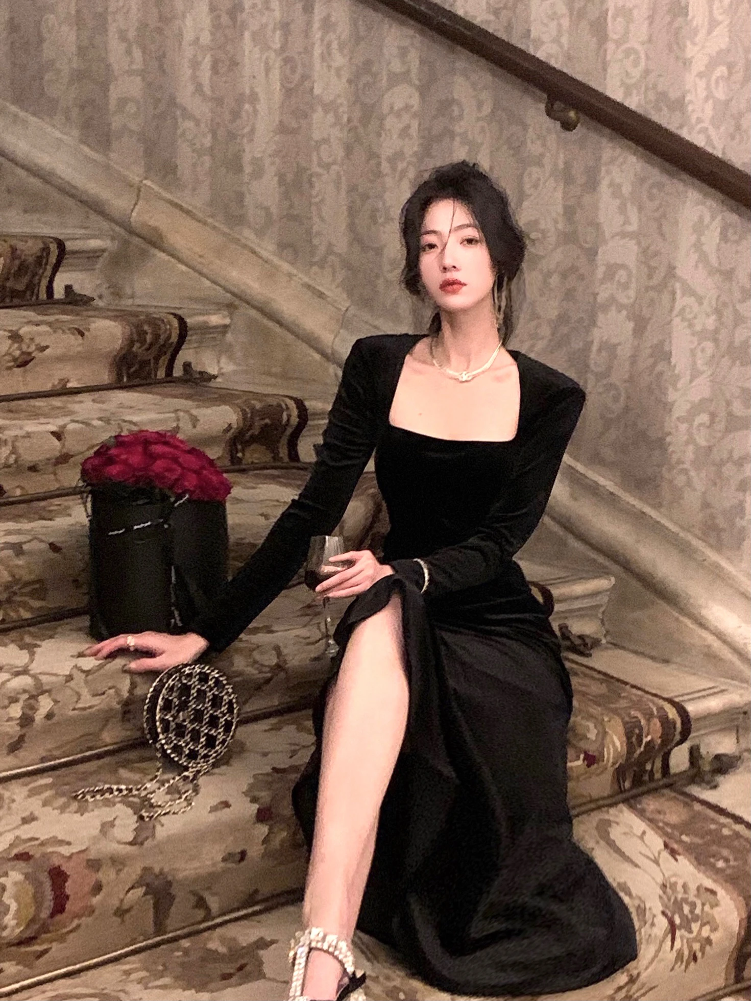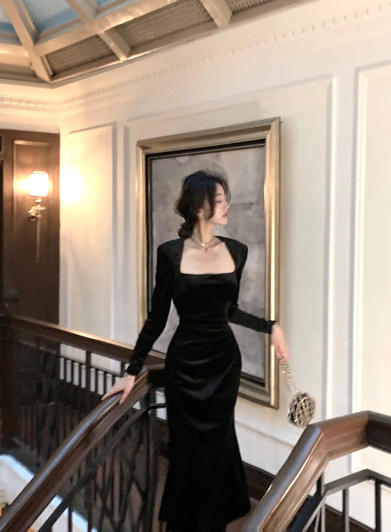 Spring New Women Elegant Long Black Velvet Dress Sexy Prom Evening Party Birthday Club Fashion One Piece Clothing