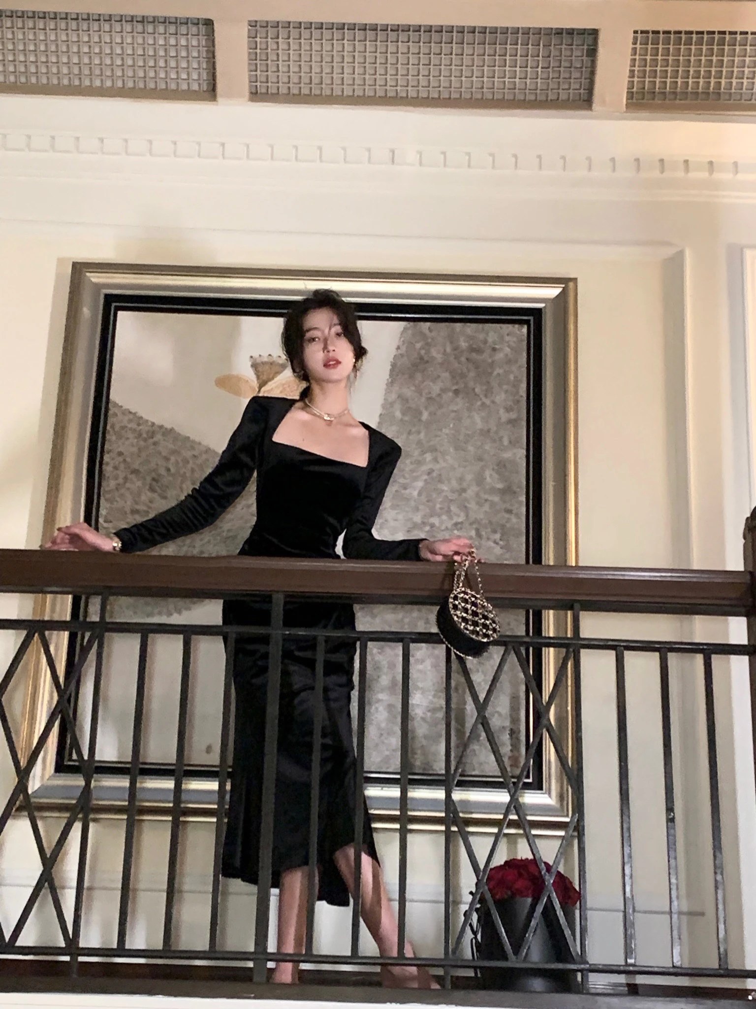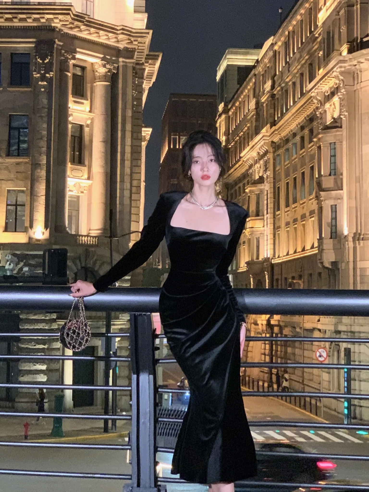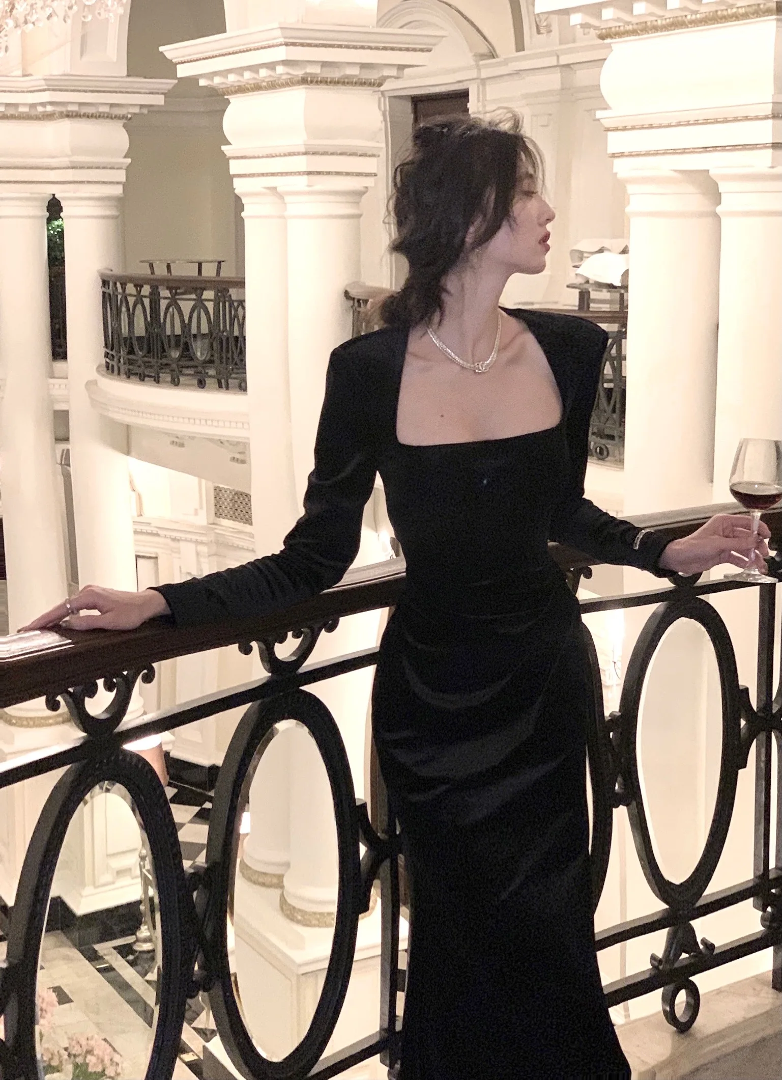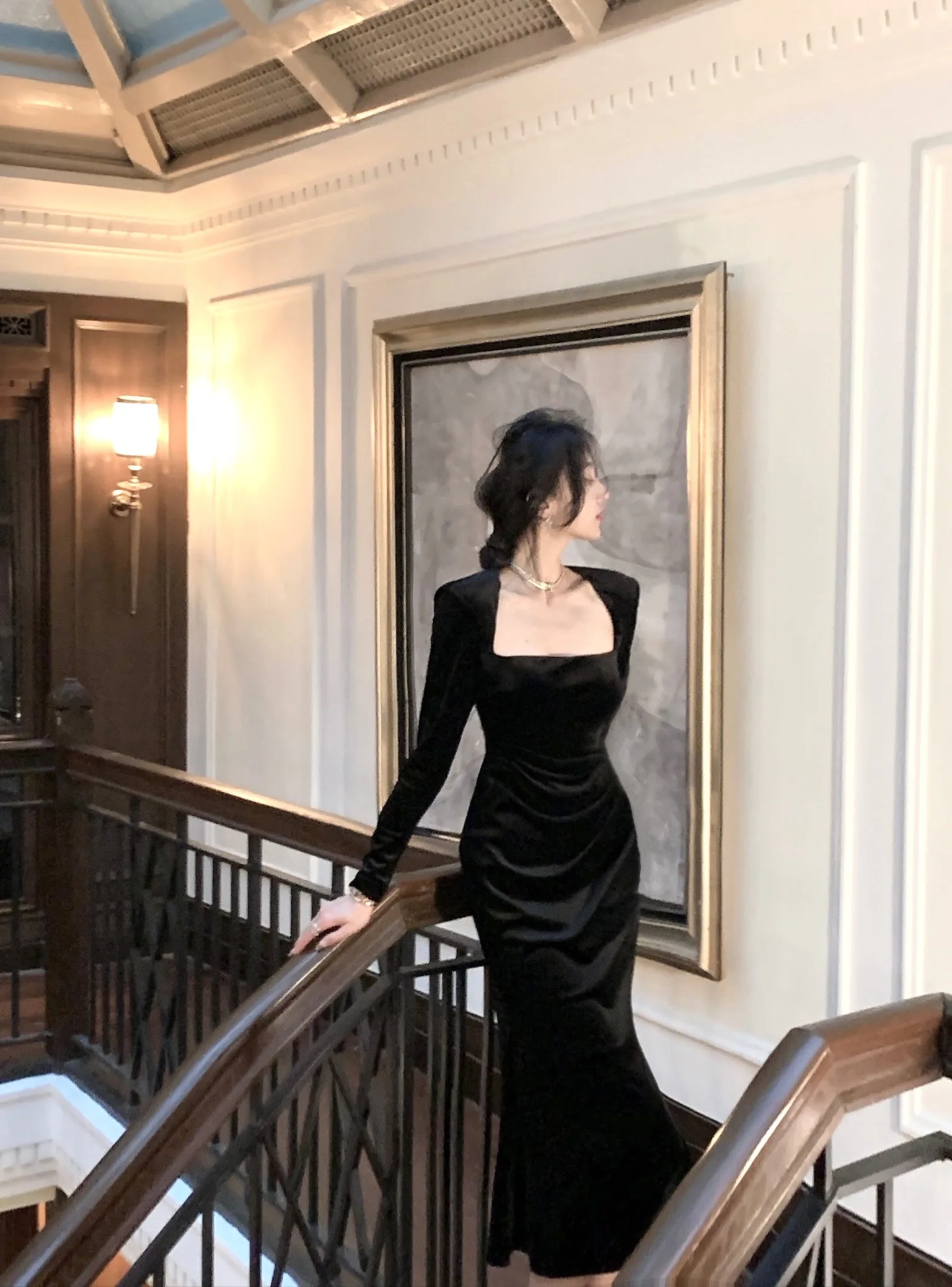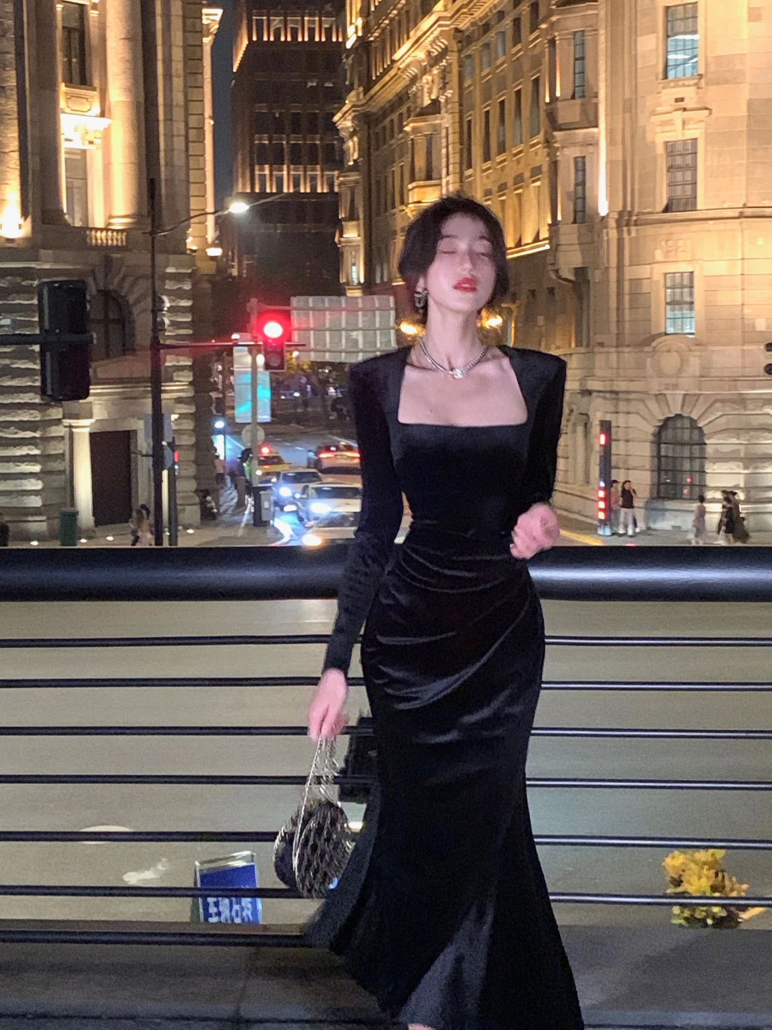 Spring New Women Elegant Long Black Velvet Dress Sexy Prom Evening Party Birthday Club Fashion One Piece Clothing